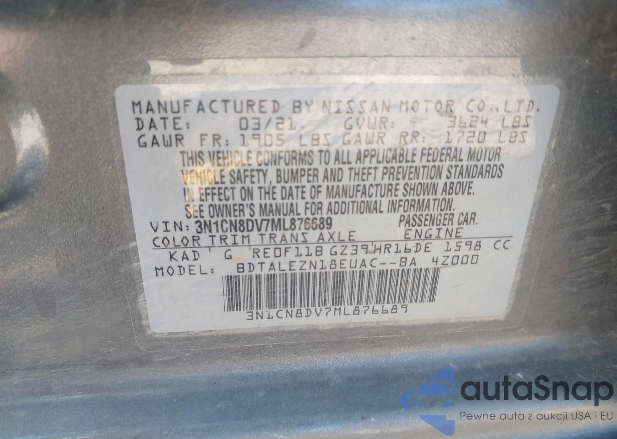 • VIN 3N1CN8DV7ML876689