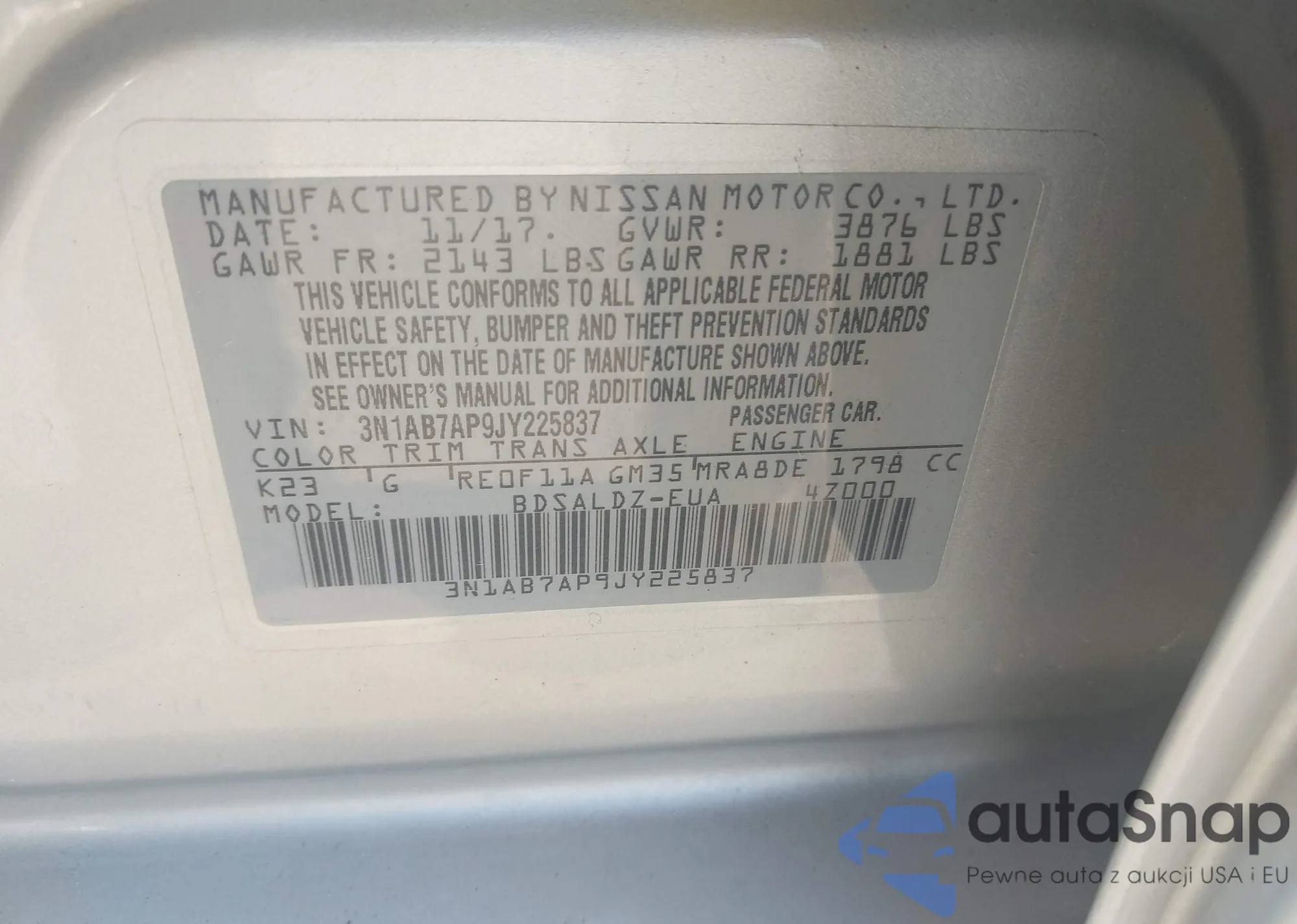 • VIN 3N1AB7AP9JY225837