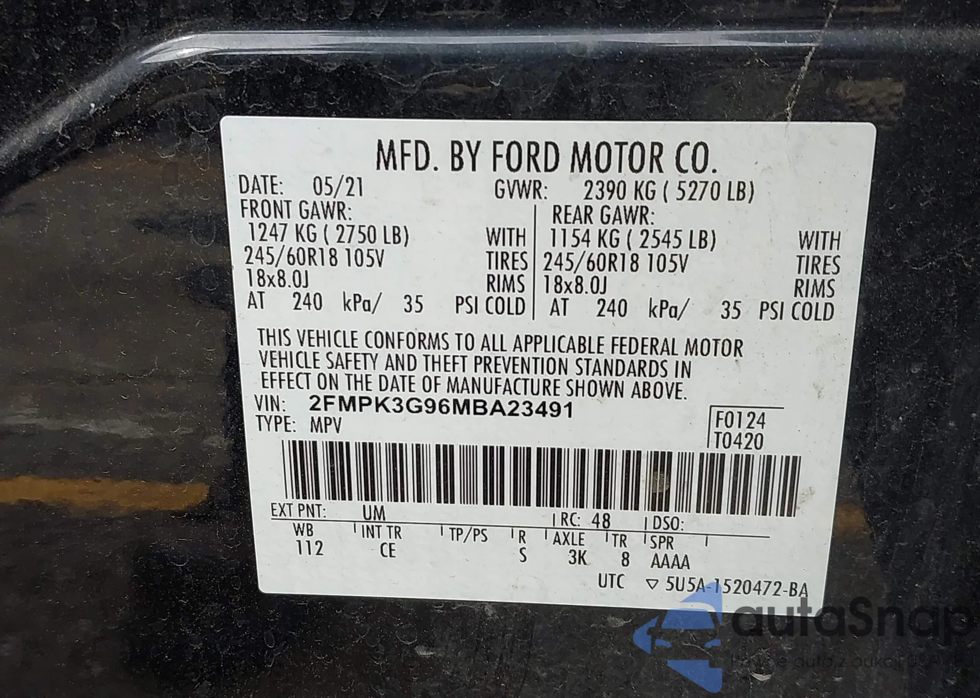 LOT: 43089580 VIN: 1FA6P8TH3R5125957
