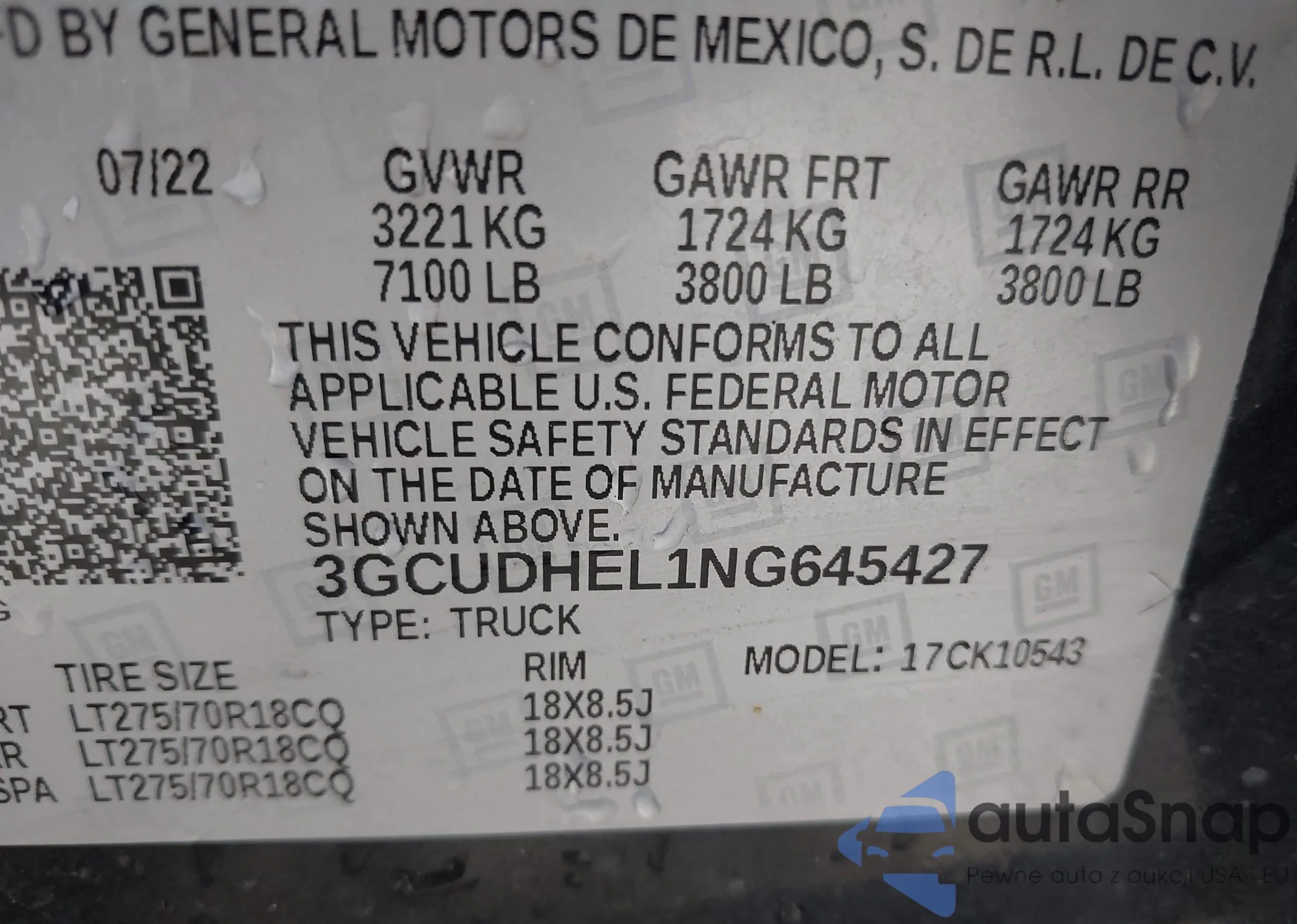 LOT: 43143622 VIN: 3GCUDHEL1NG645427