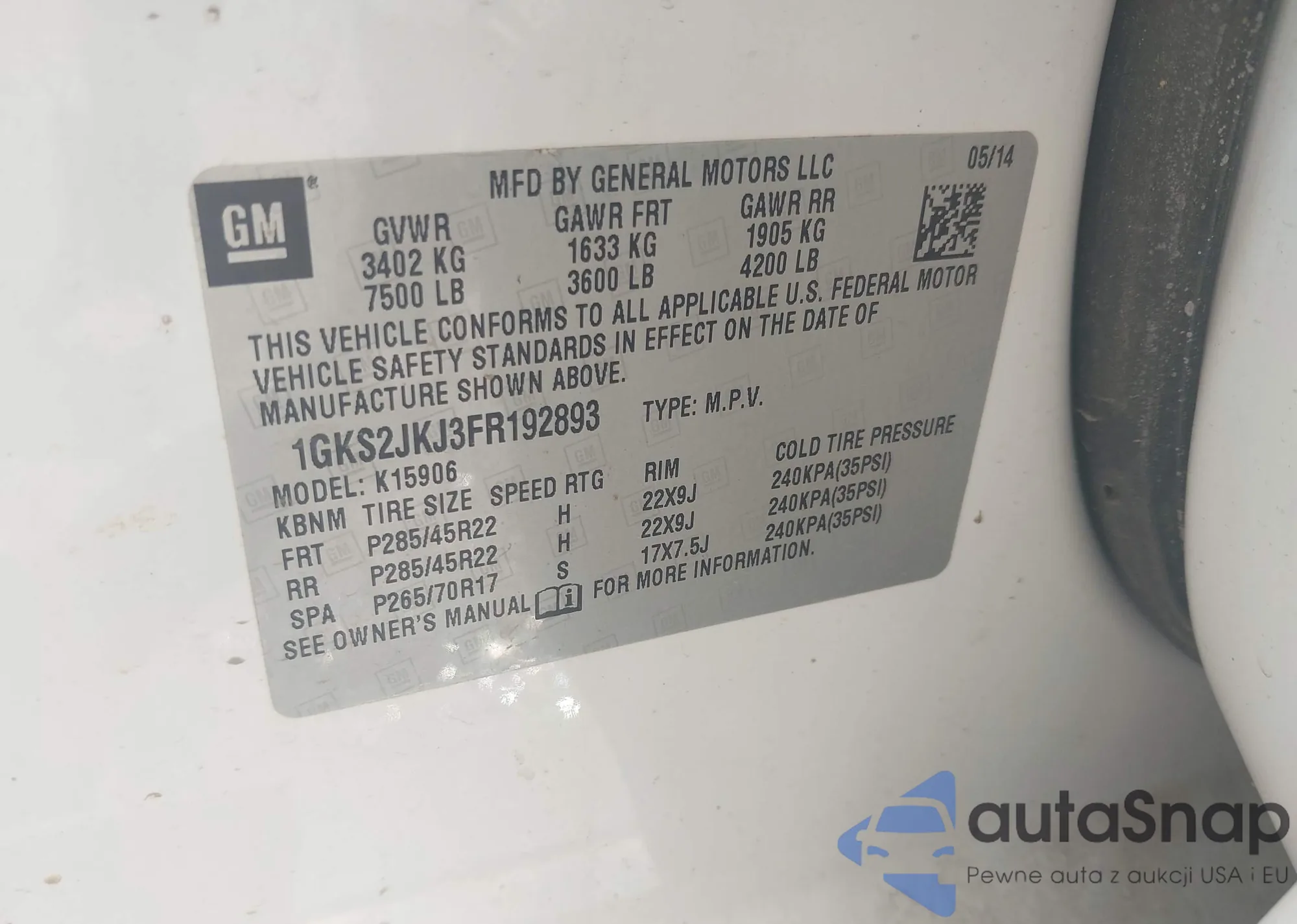 • VIN 1GKS2JKJ3FR192893