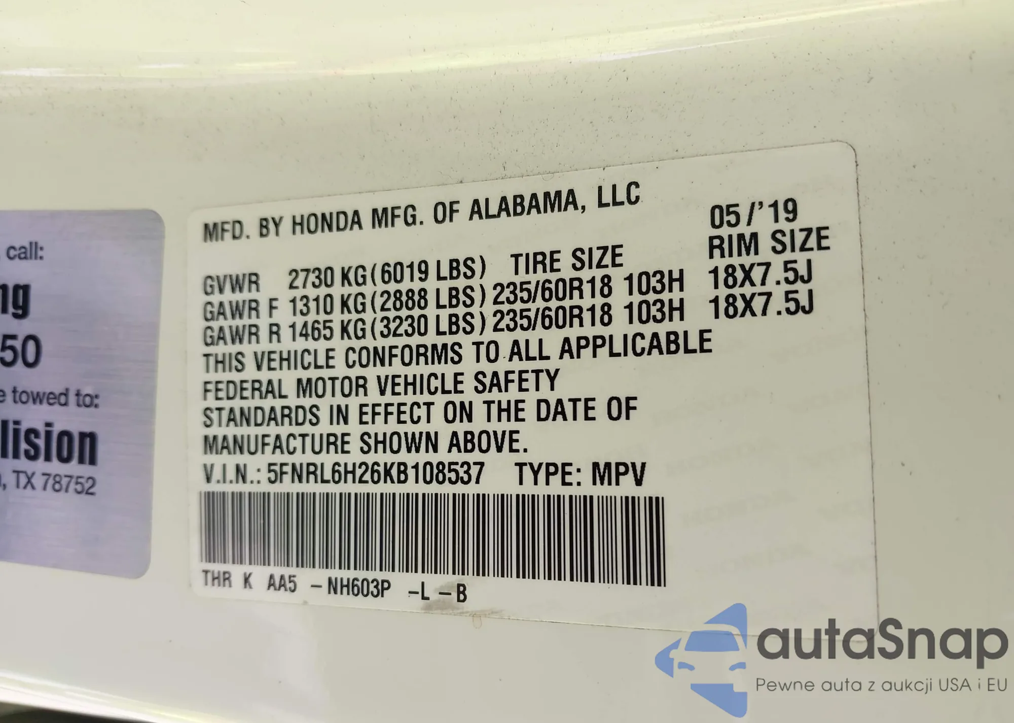 • VIN 5FNRL6H26KB108537