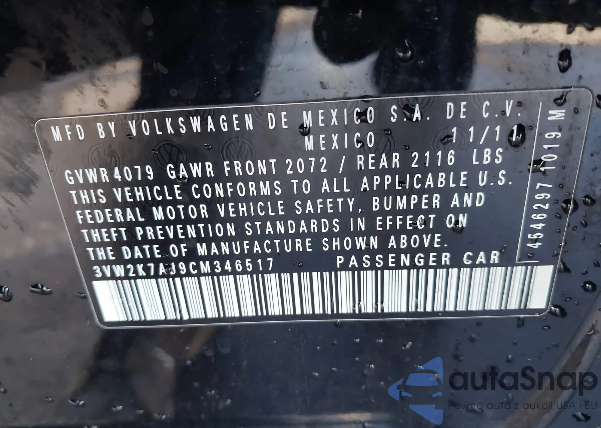• VIN 3VW2K7AJ9CM346517