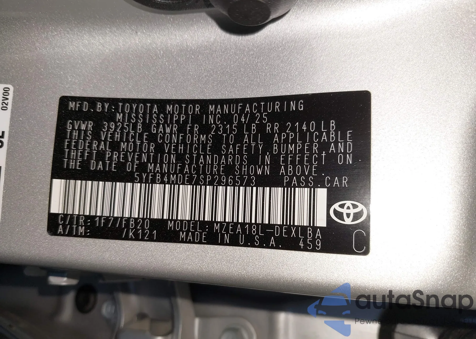 • VIN 5YFB4MDE7SP296573