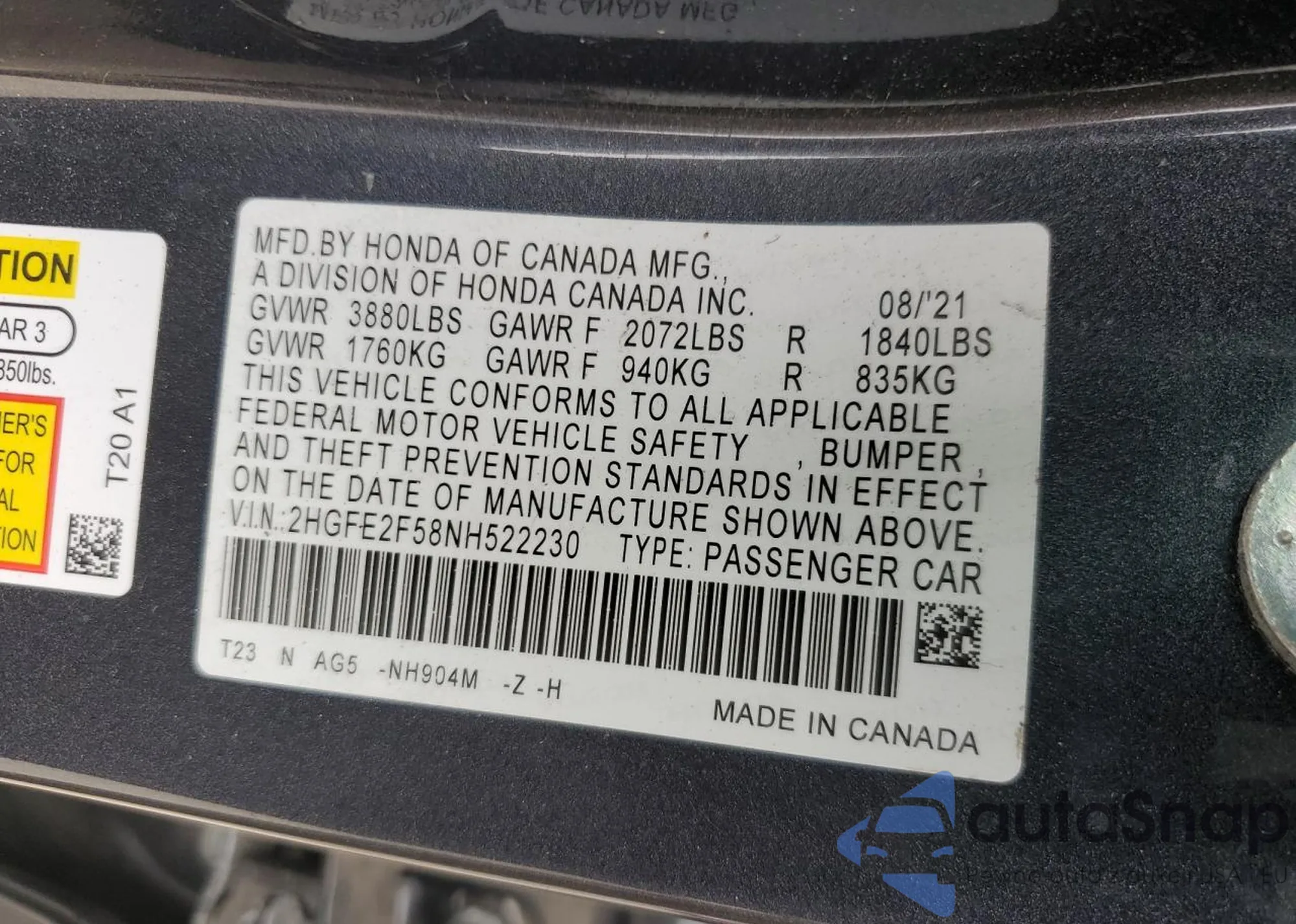 LOT: 70226765 VIN: 2HGFE2F58NH522230