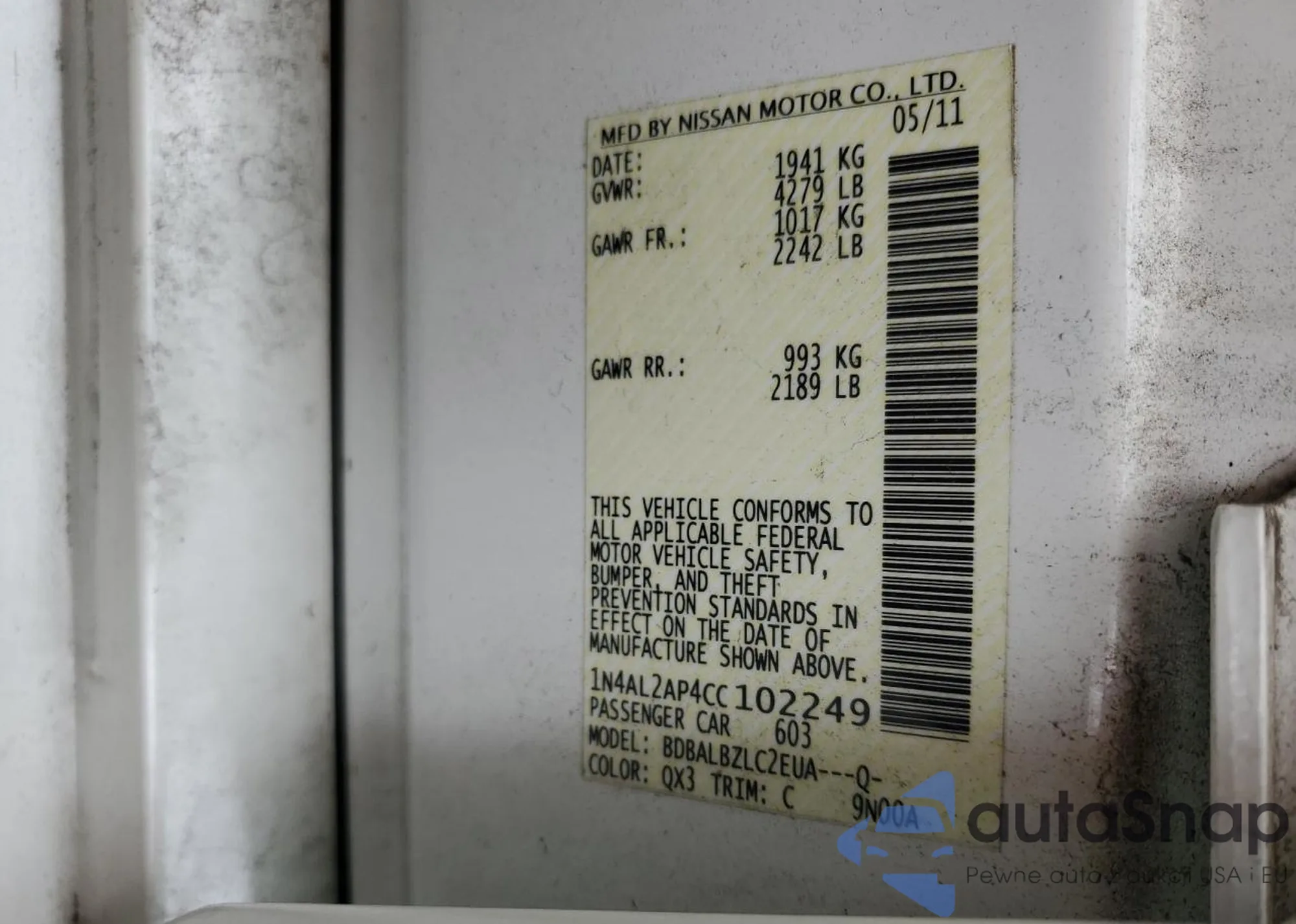 • VIN 1N4AL2AP4CC102249