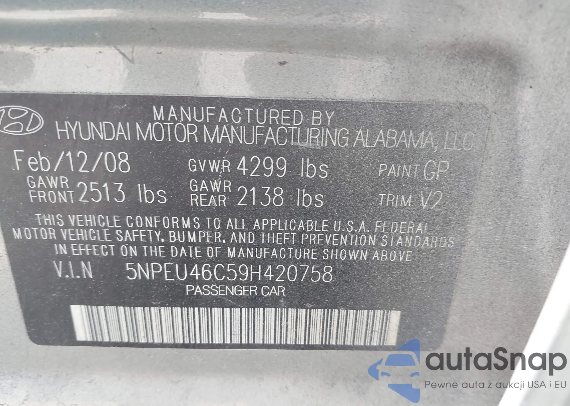 LOT: 43124886 VIN: 5NPEU46C59H420758