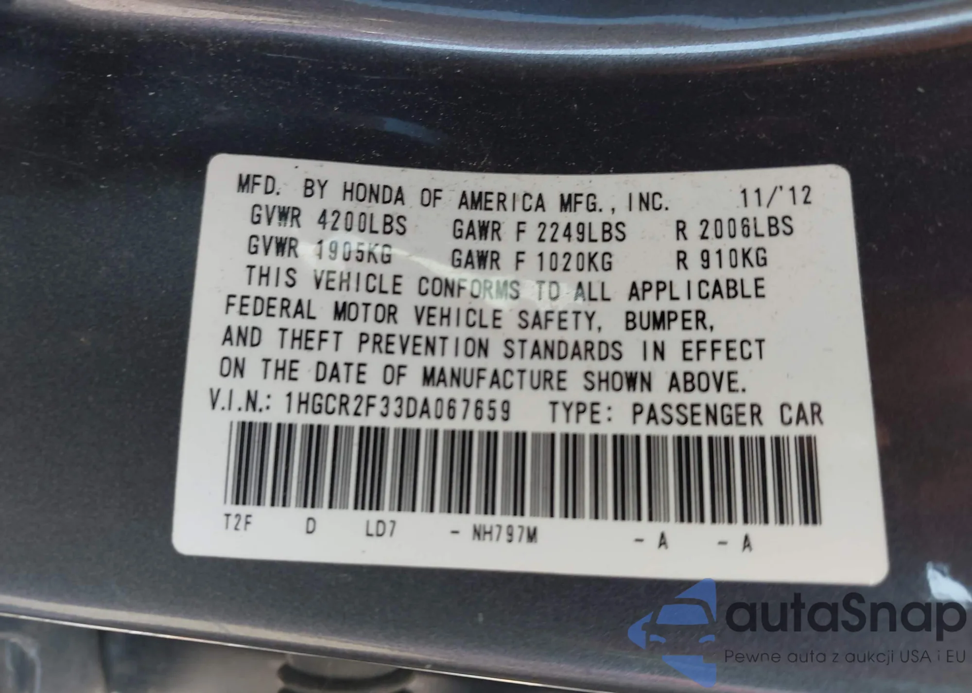 • VIN 1HGCR2F33DA067659