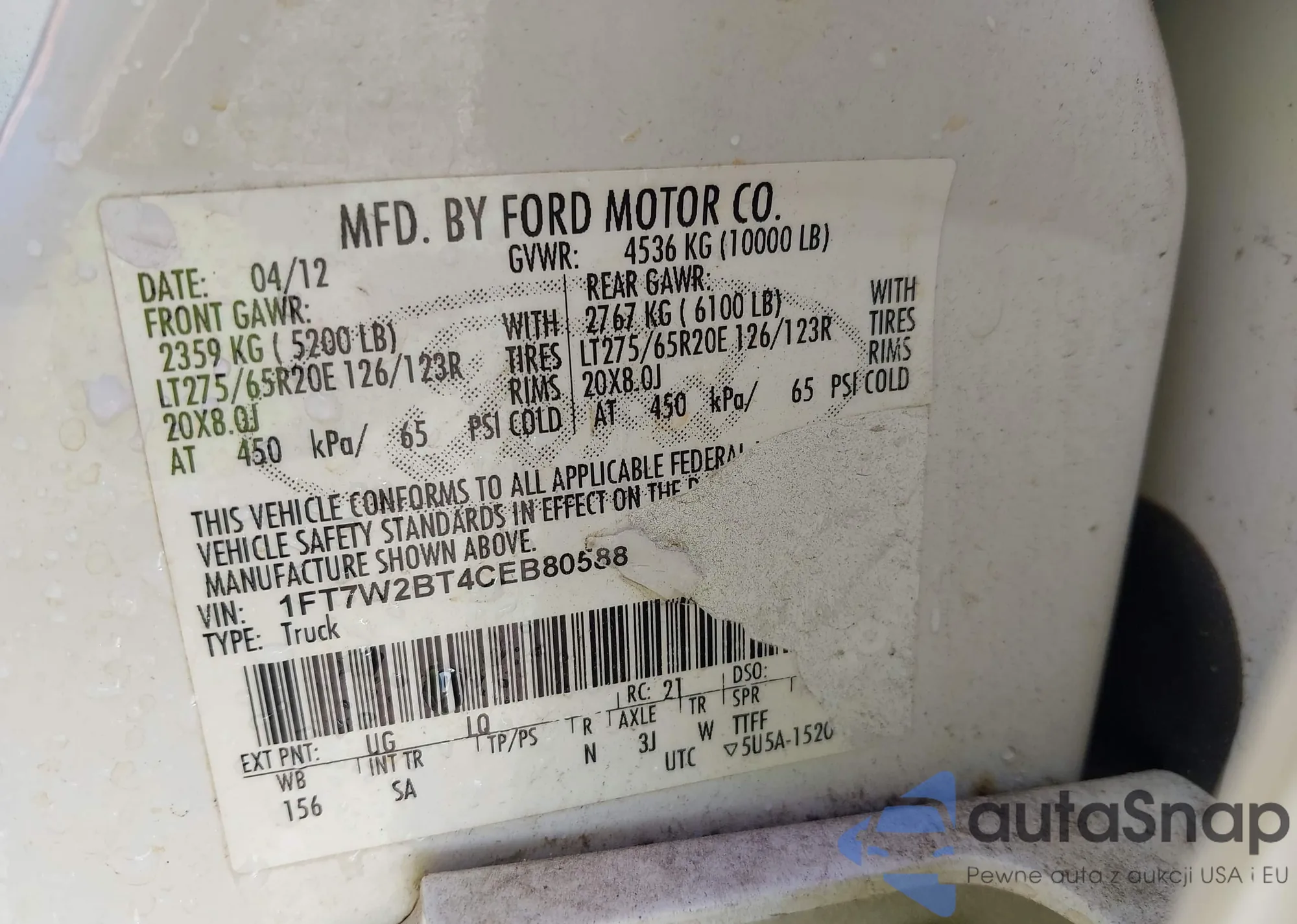 LOT: 43018329 VIN: 1FT7W2BT4CEB80588