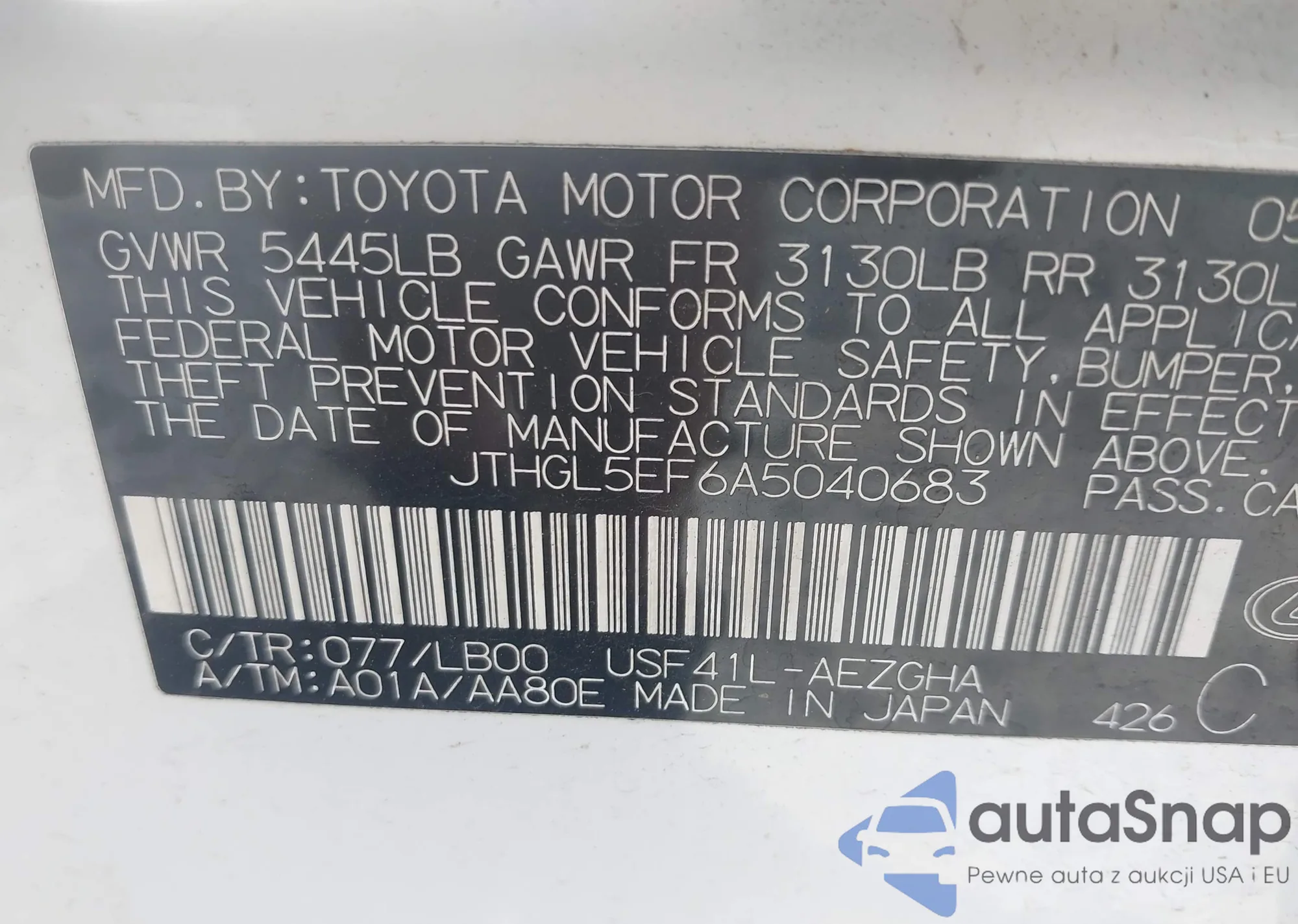 • VIN JTHGL5EF6A5040683