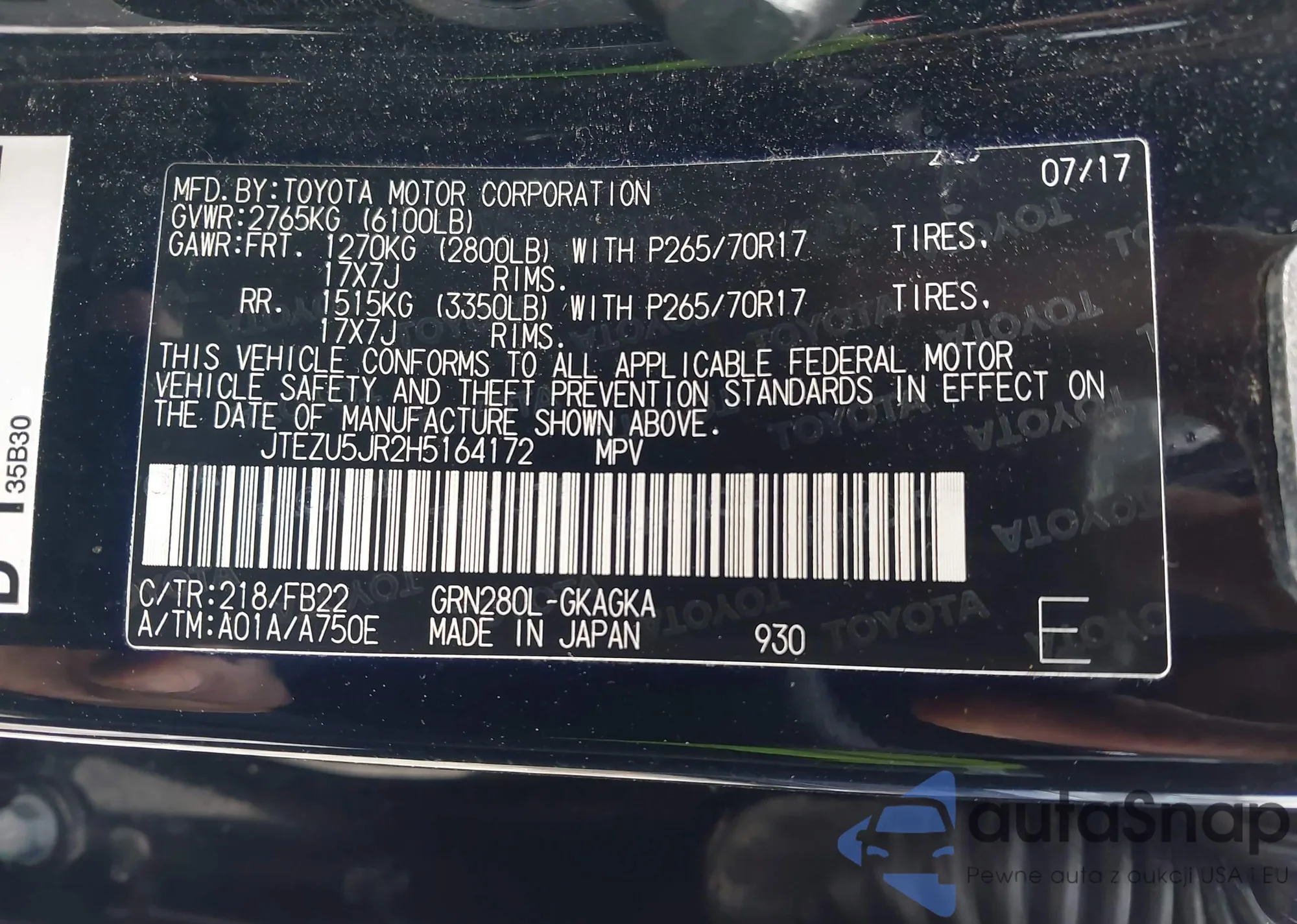LOT: 43255912 VIN: JTEZU5JR2H5164172