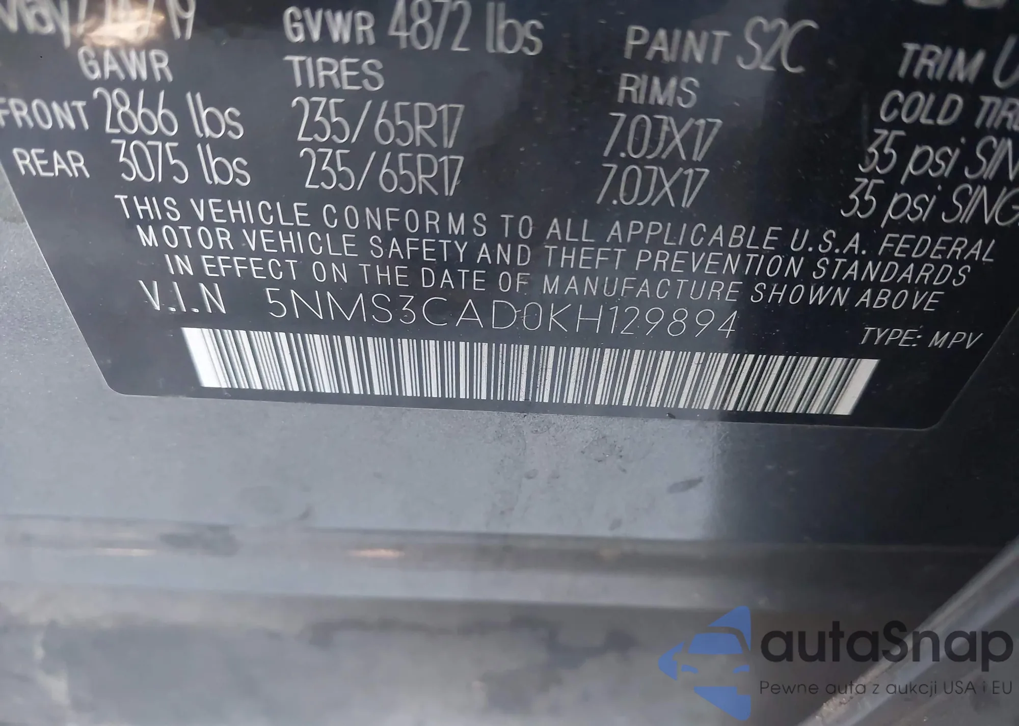 • VIN 5NMS3CAD0KH129894