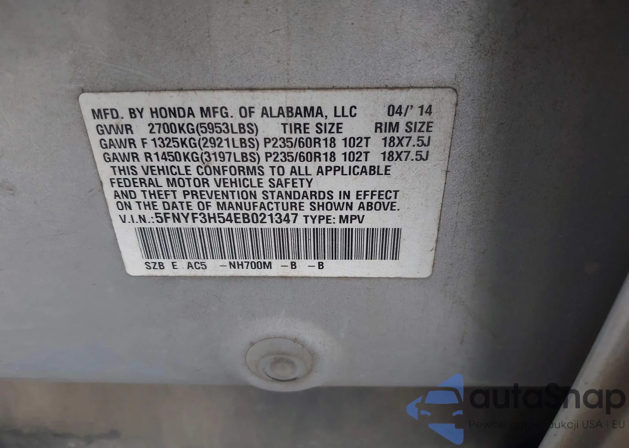 LOT: 43310218 VIN: 5FNYF3H54EB021347