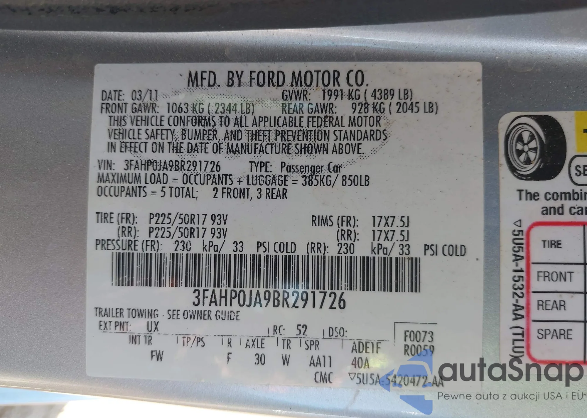 • VIN 3FAHP0JA9BR291726