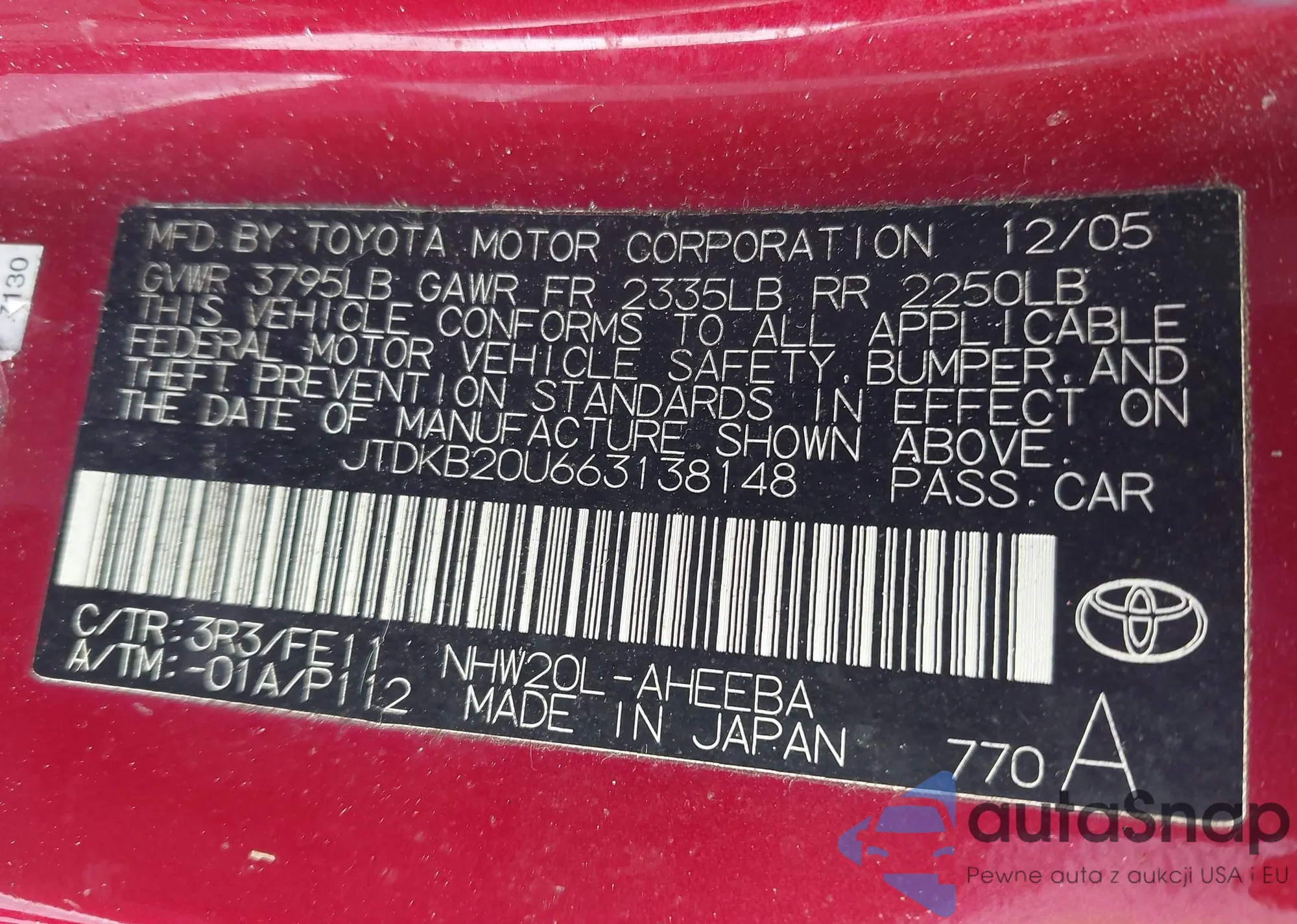 LOT: 43373613 VIN: JTDKB20U663138148