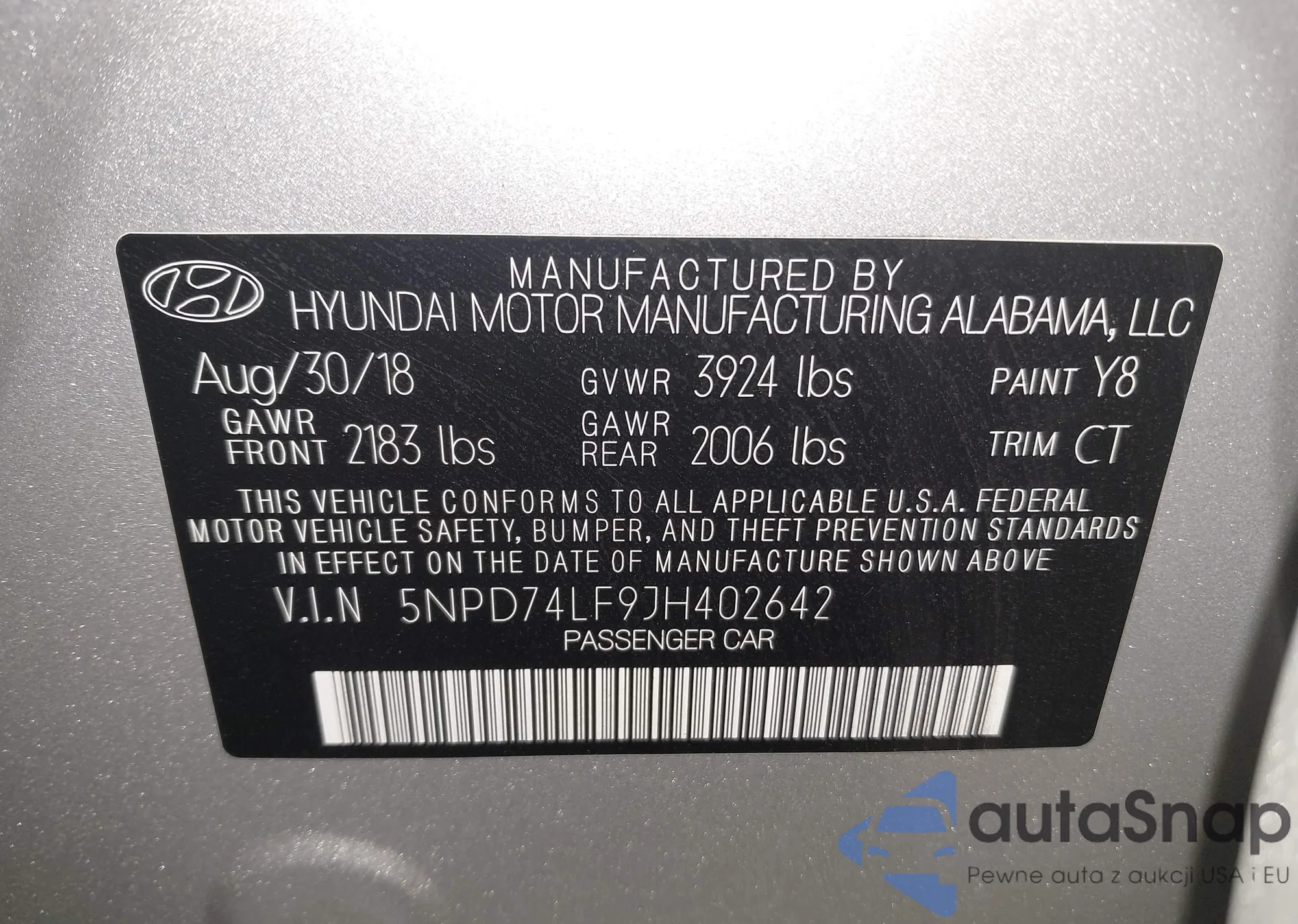 LOT: 43211321 VIN: 5NPD74LF9JH402642
