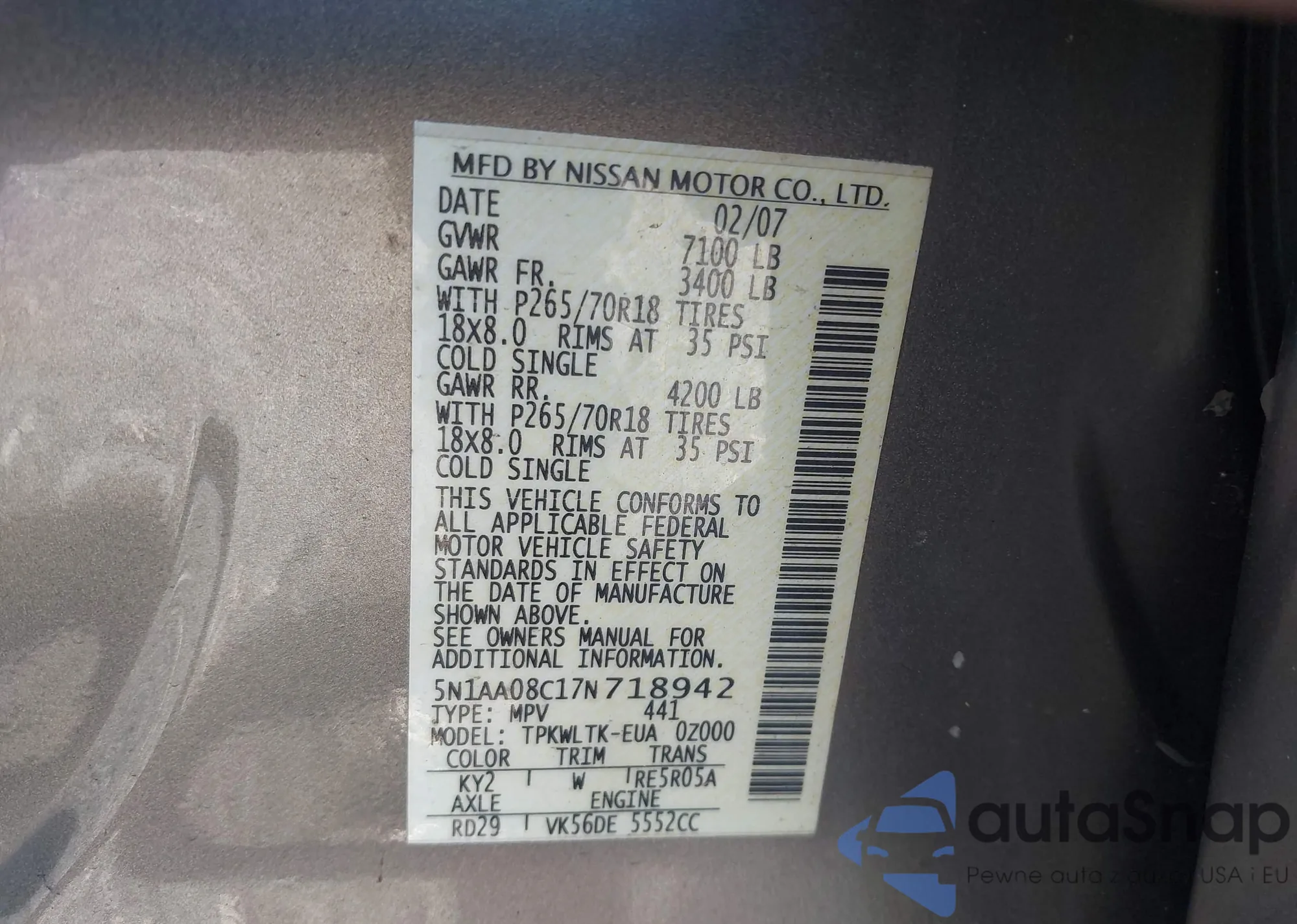 • VIN 5N1AA08C17N718942