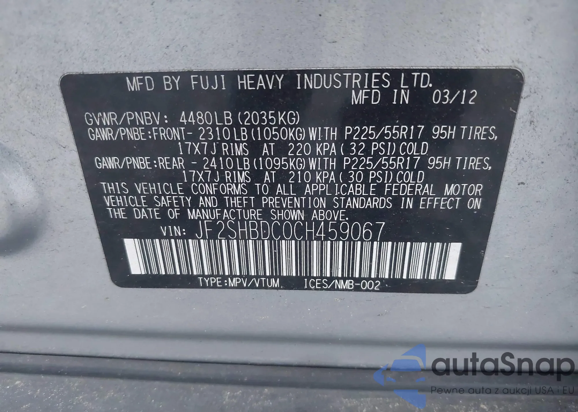 LOT: 43386560 VIN: JF2SHBDC0CH459067