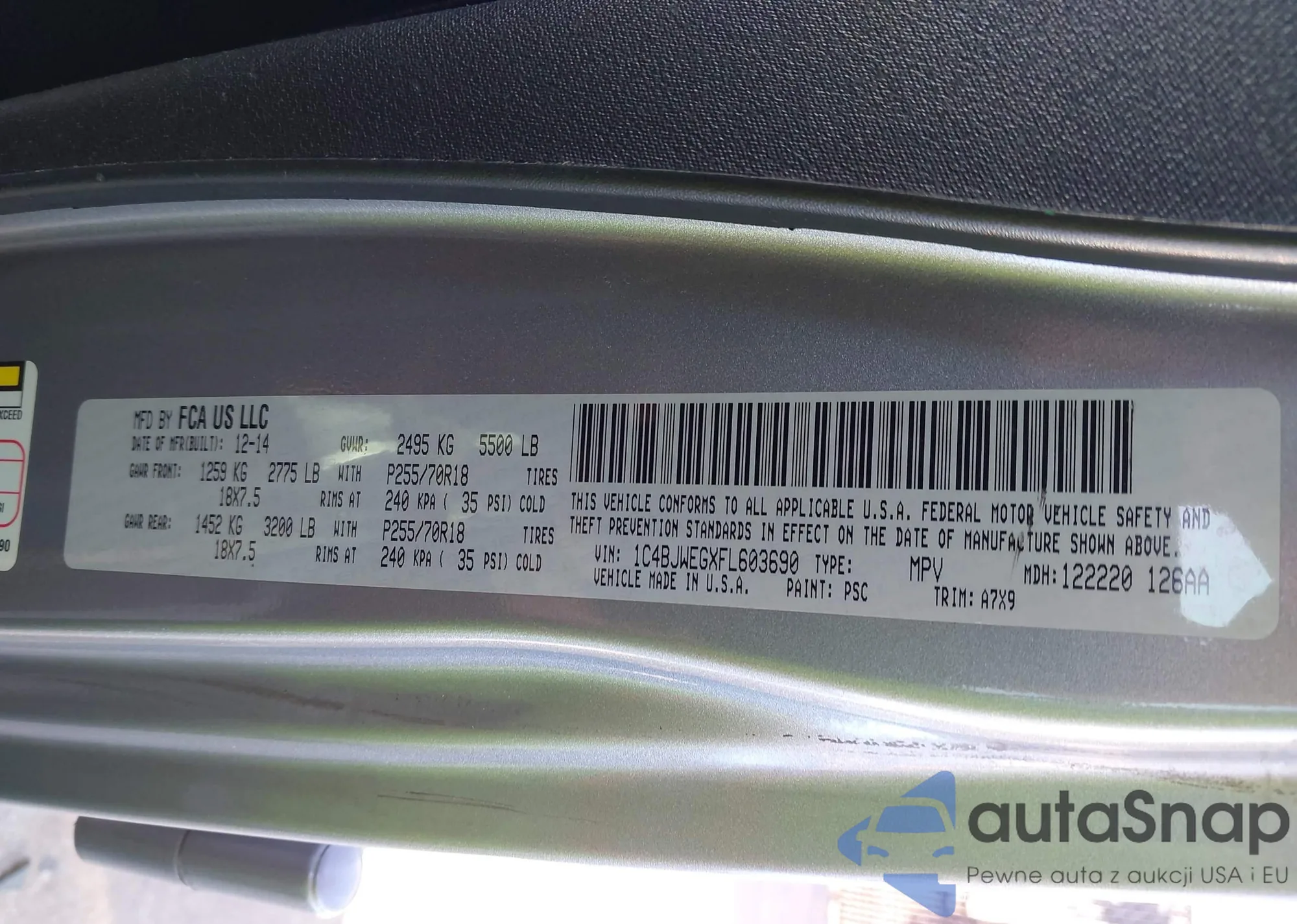 LOT: 43396619 VIN: 1C4BJWEGXFL603690