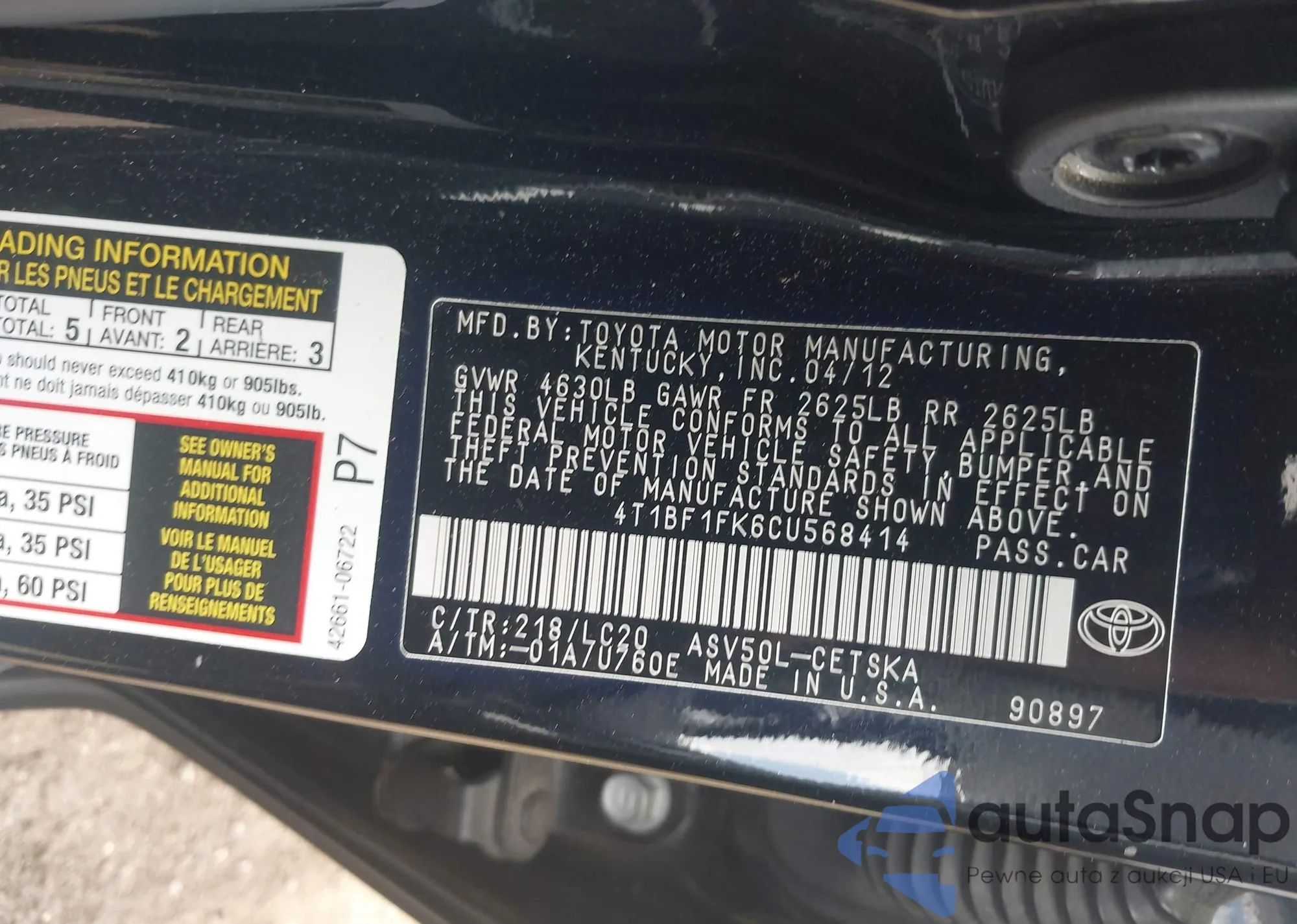LOT: 43417404 VIN: 4T1BF1FK6CU568414