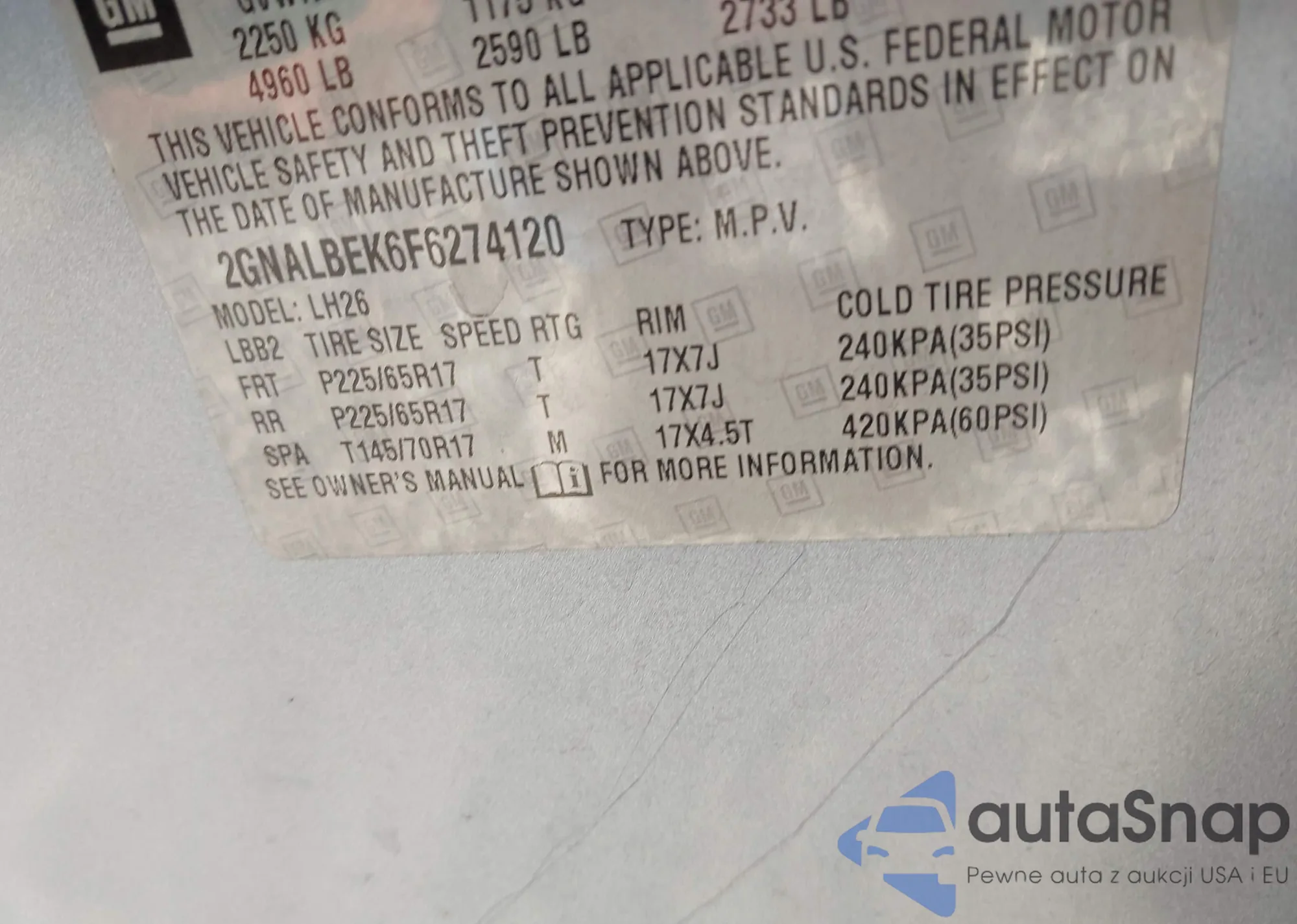 LOT: 43436981 VIN: 2GNALBEK6F6274120
