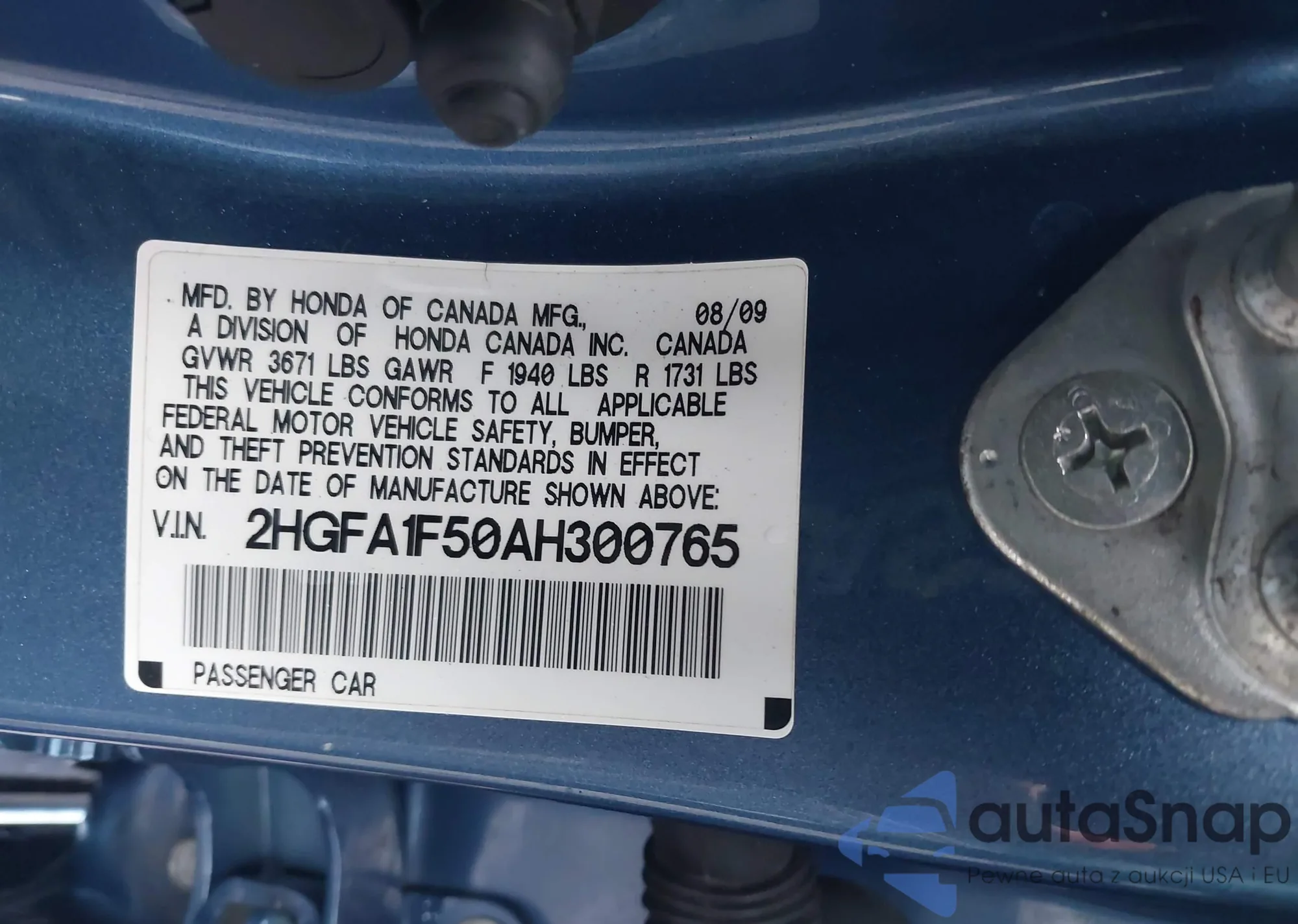• VIN 2HGFA1F50AH300765