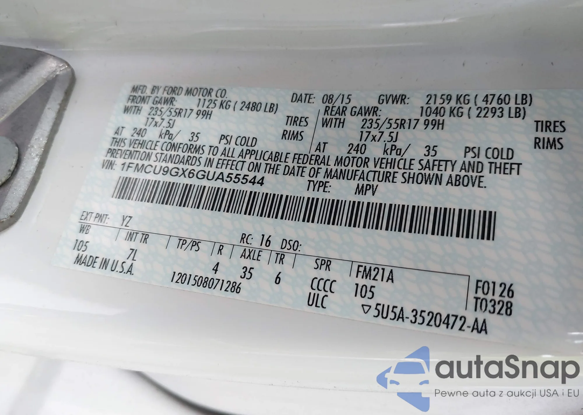 • VIN 1FMCU9GX6GUA55544