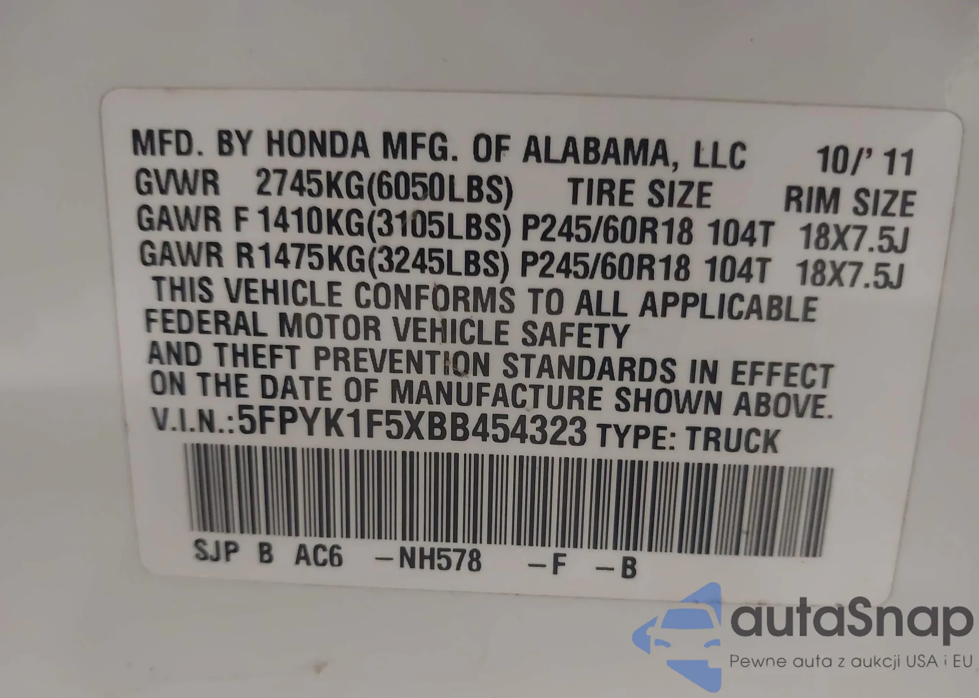 • VIN 5FPYK1F5XBB454323