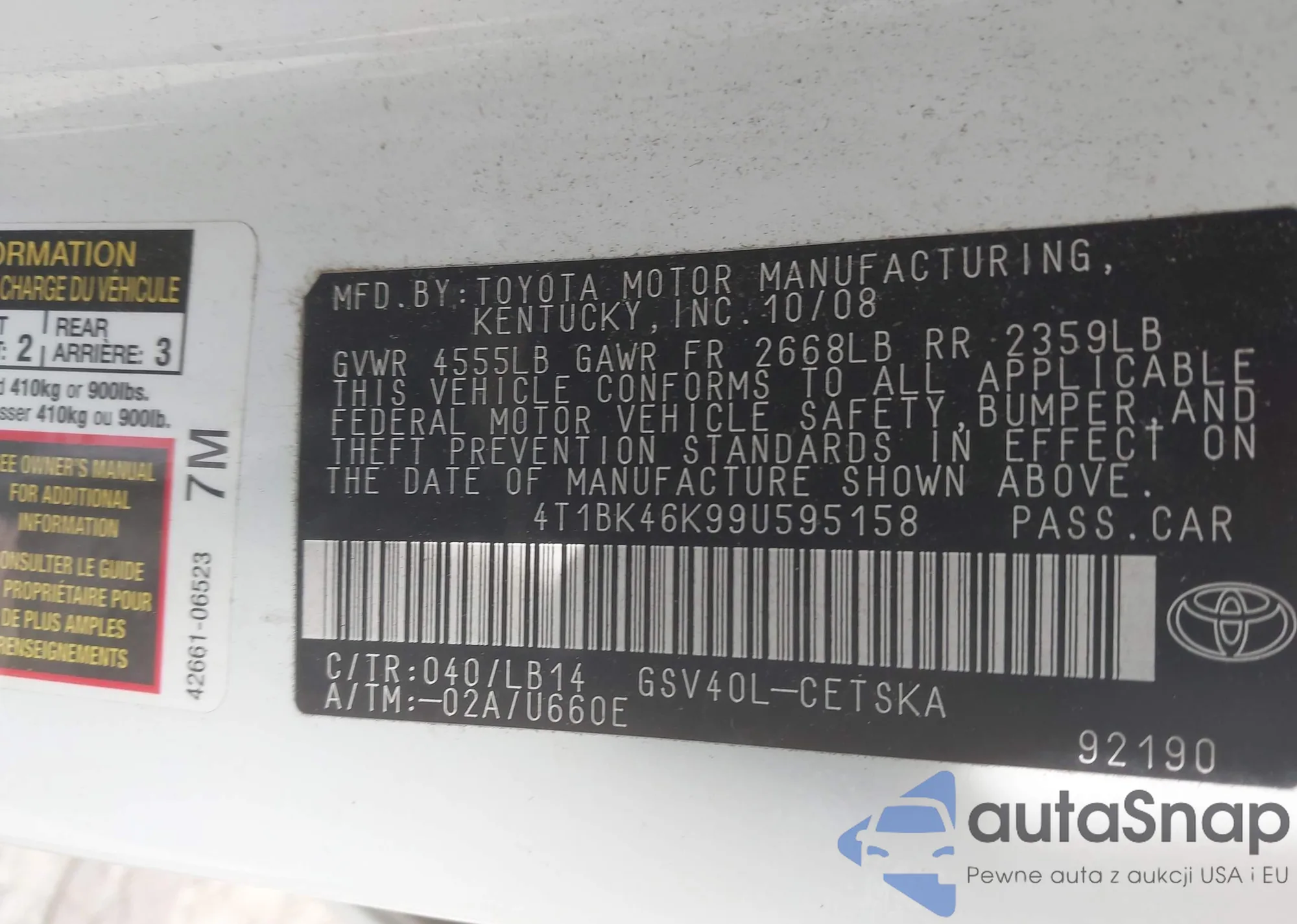 LOT: 43453893 VIN: 4T1BK46K99U595158