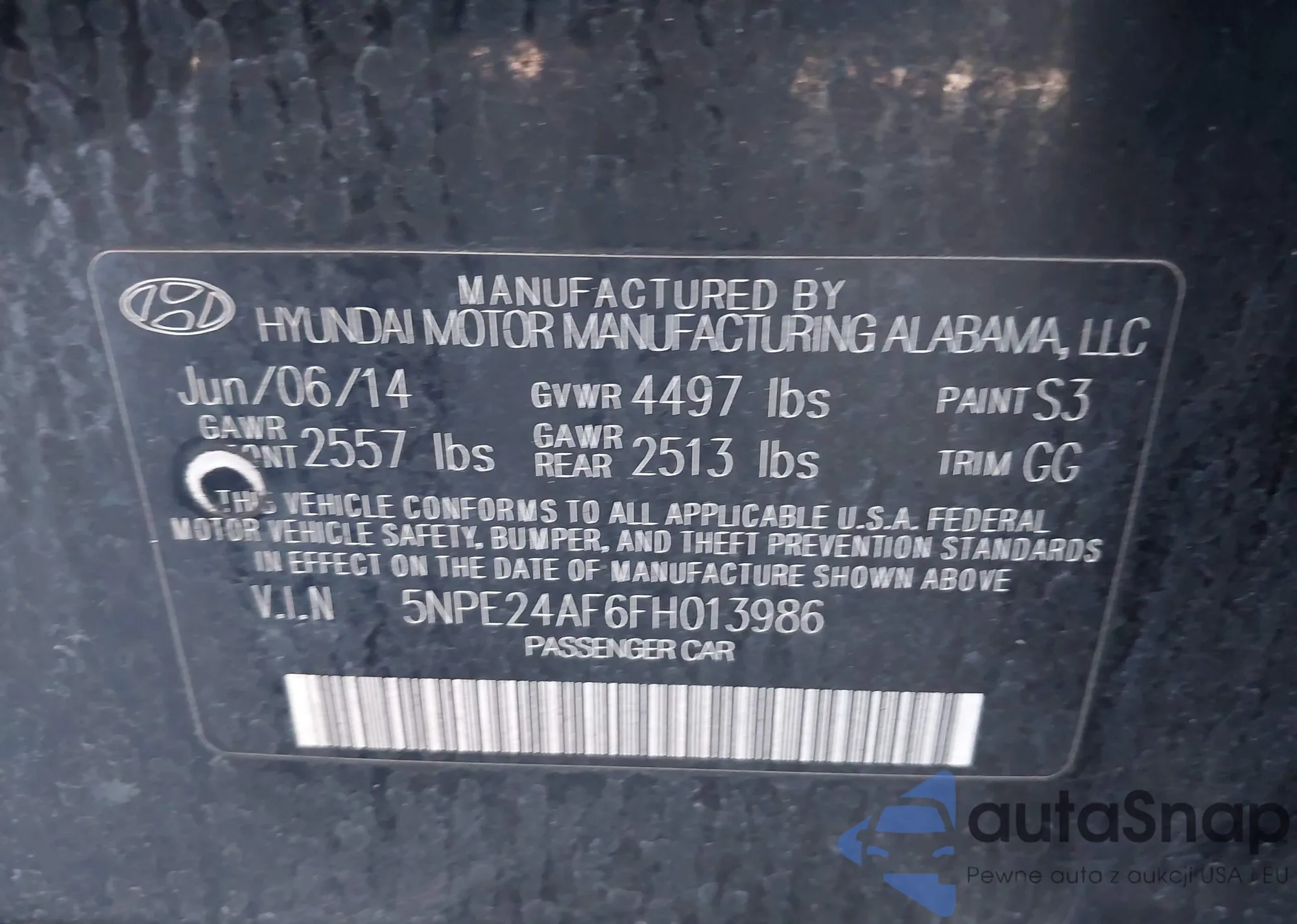 • VIN 5NPE24AF6FH013986