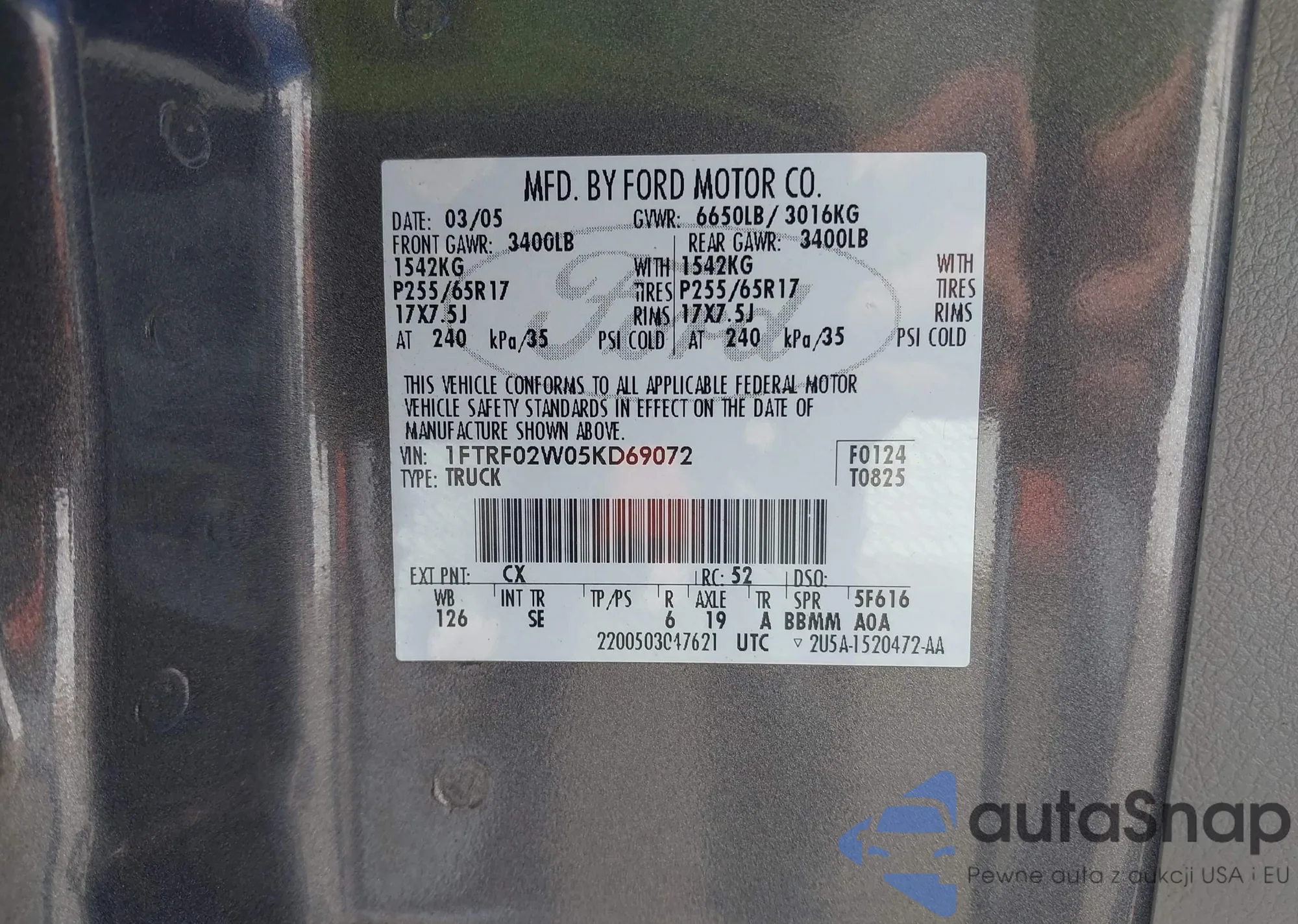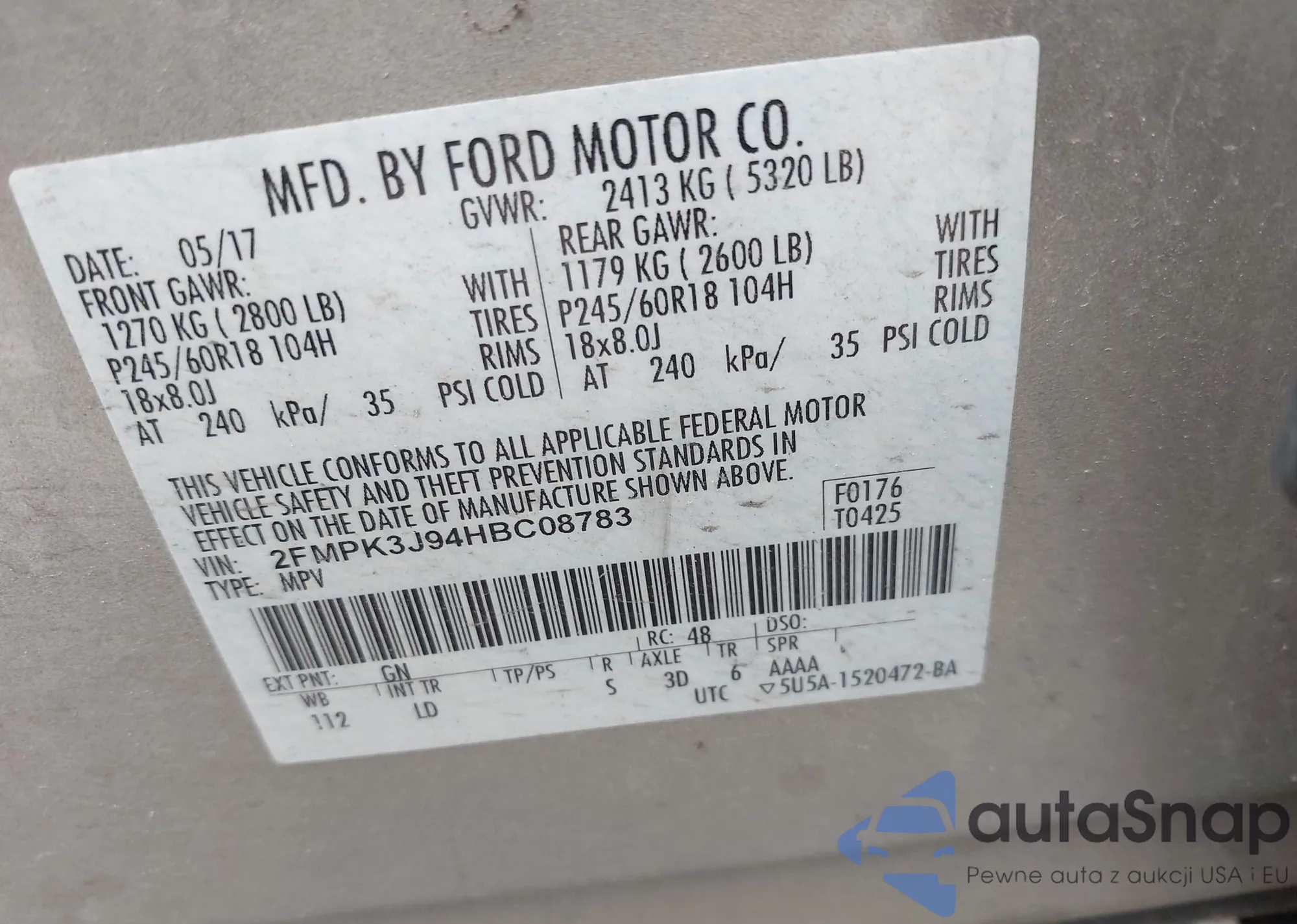 LOT: 42198417 VIN: 2FMPK3J94HBC08783