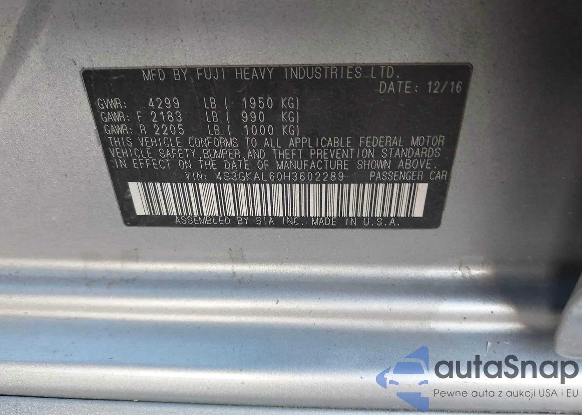 • VIN 4S3GKAL60H3602289