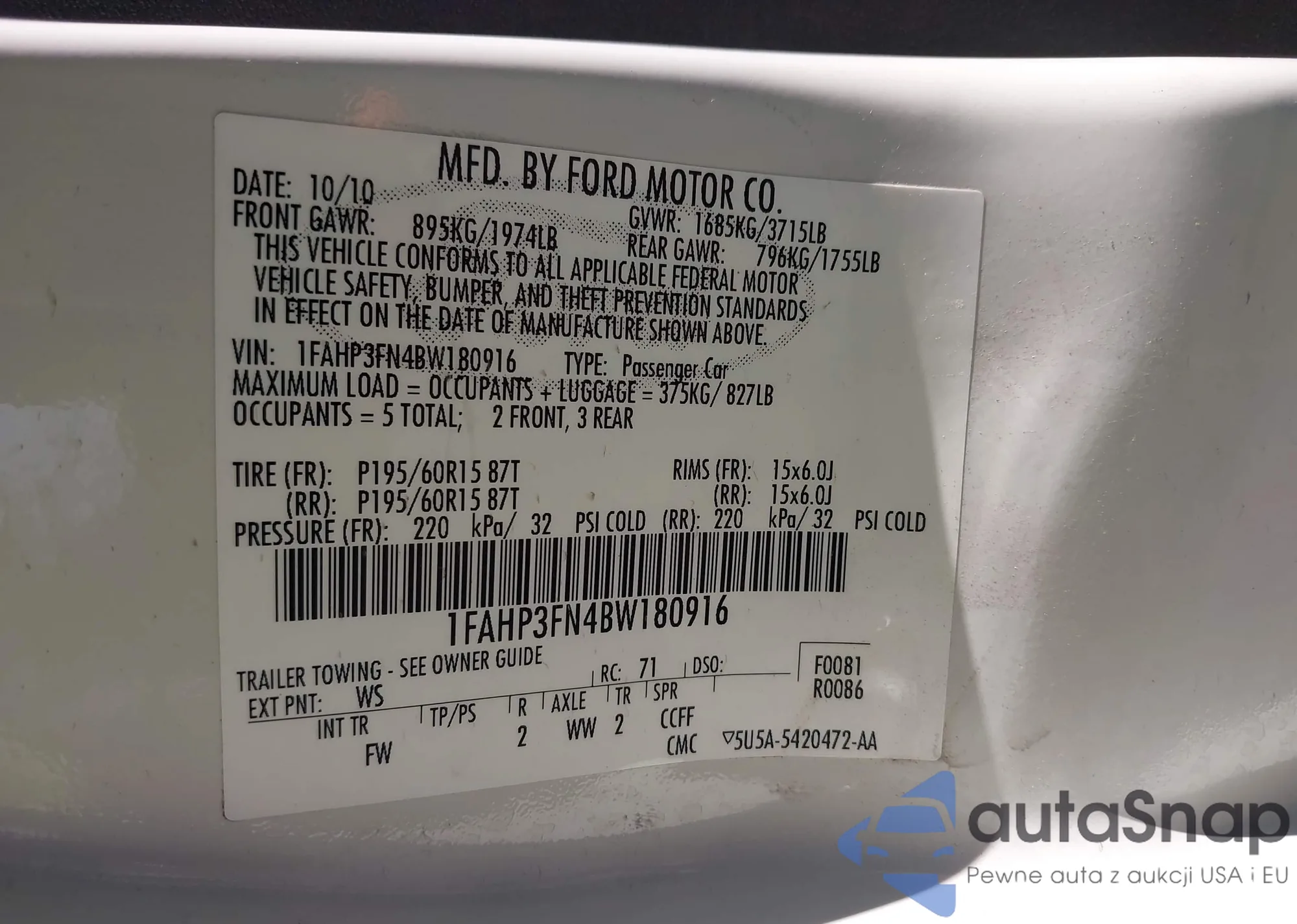 LOT: 43469168 VIN: 1FAHP3FN4BW180916