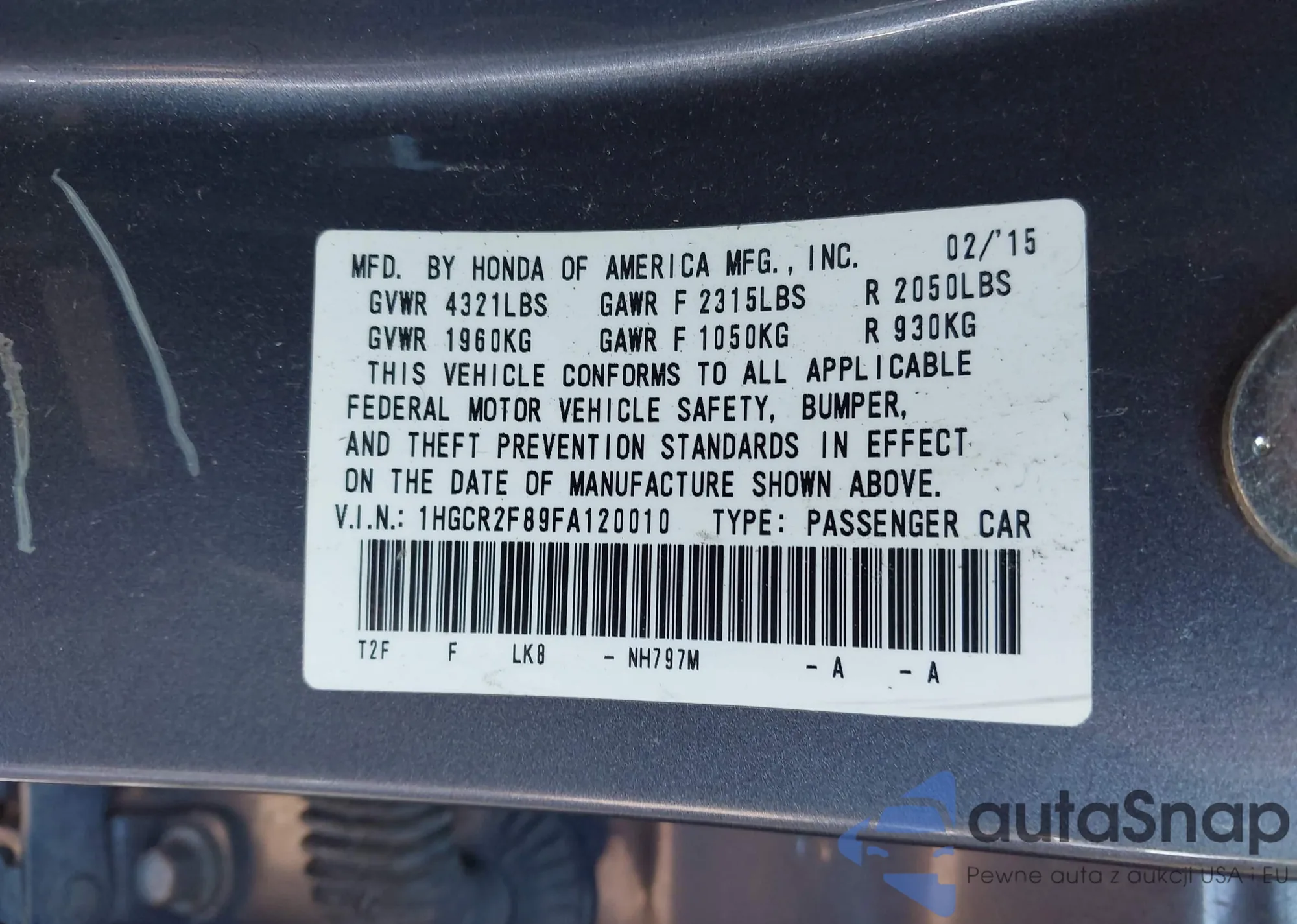 LOT: 43498154 VIN: 1HGCR2F89FA120010