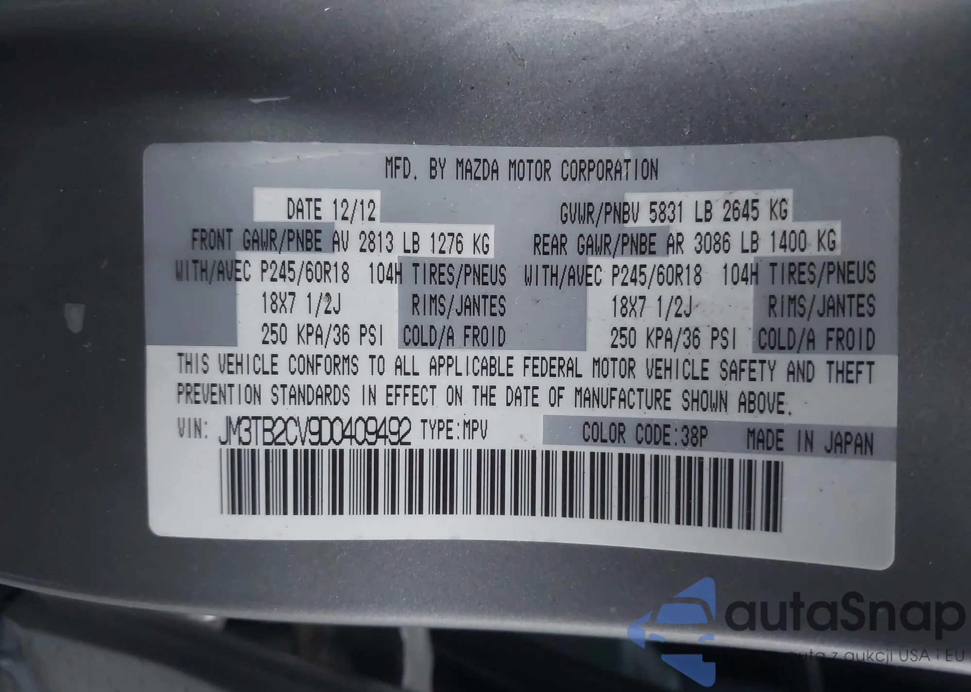 • VIN JM3TB2CV9D0409492