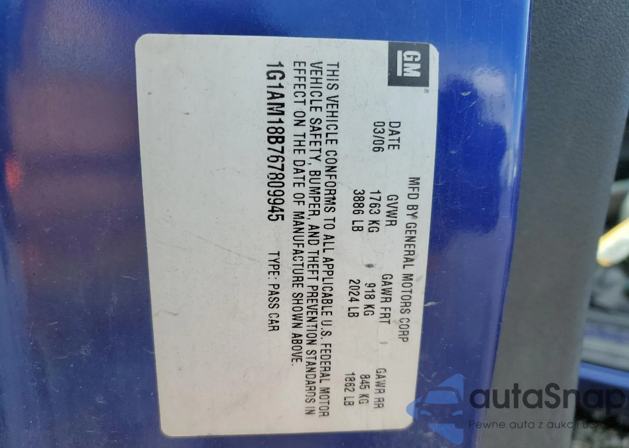 LOT: 86729005 VIN: 1G1AM18B767809945