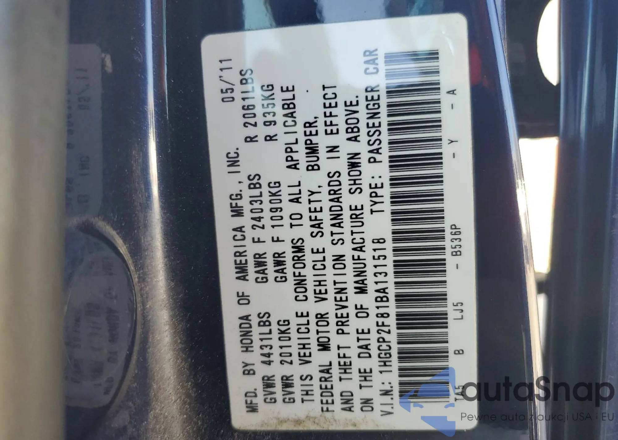 • VIN 1HGCP2F81BA131518