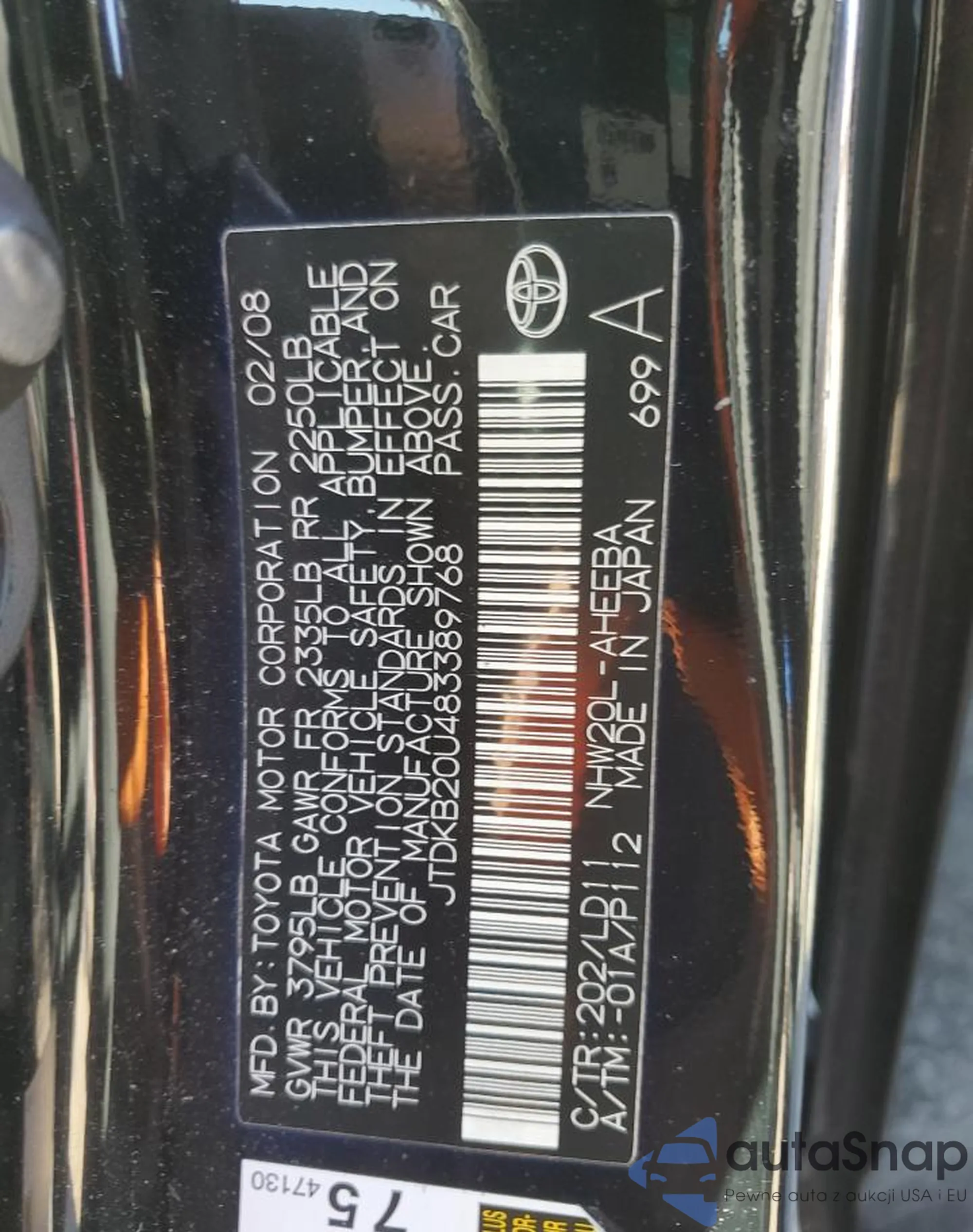 LOT: 86842085 VIN: JTDKB20U483389768