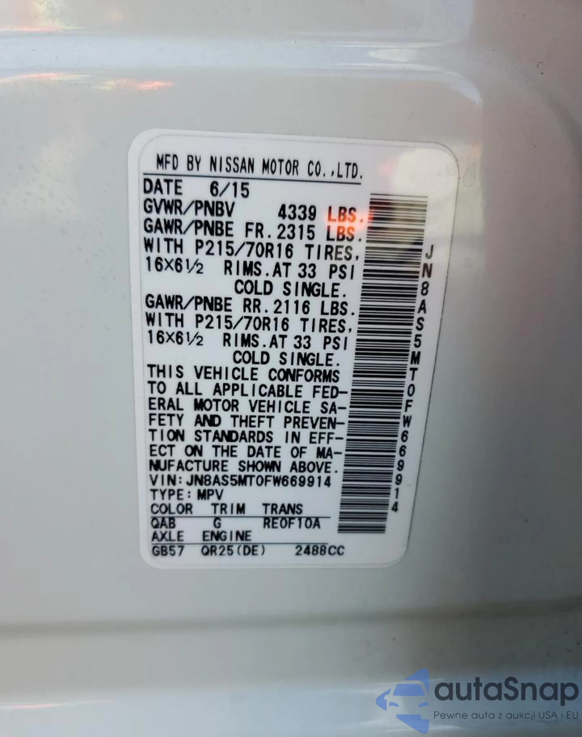 2015 Nissan Rogue Sele z USA, uszkodzony, nr VIN 669914
