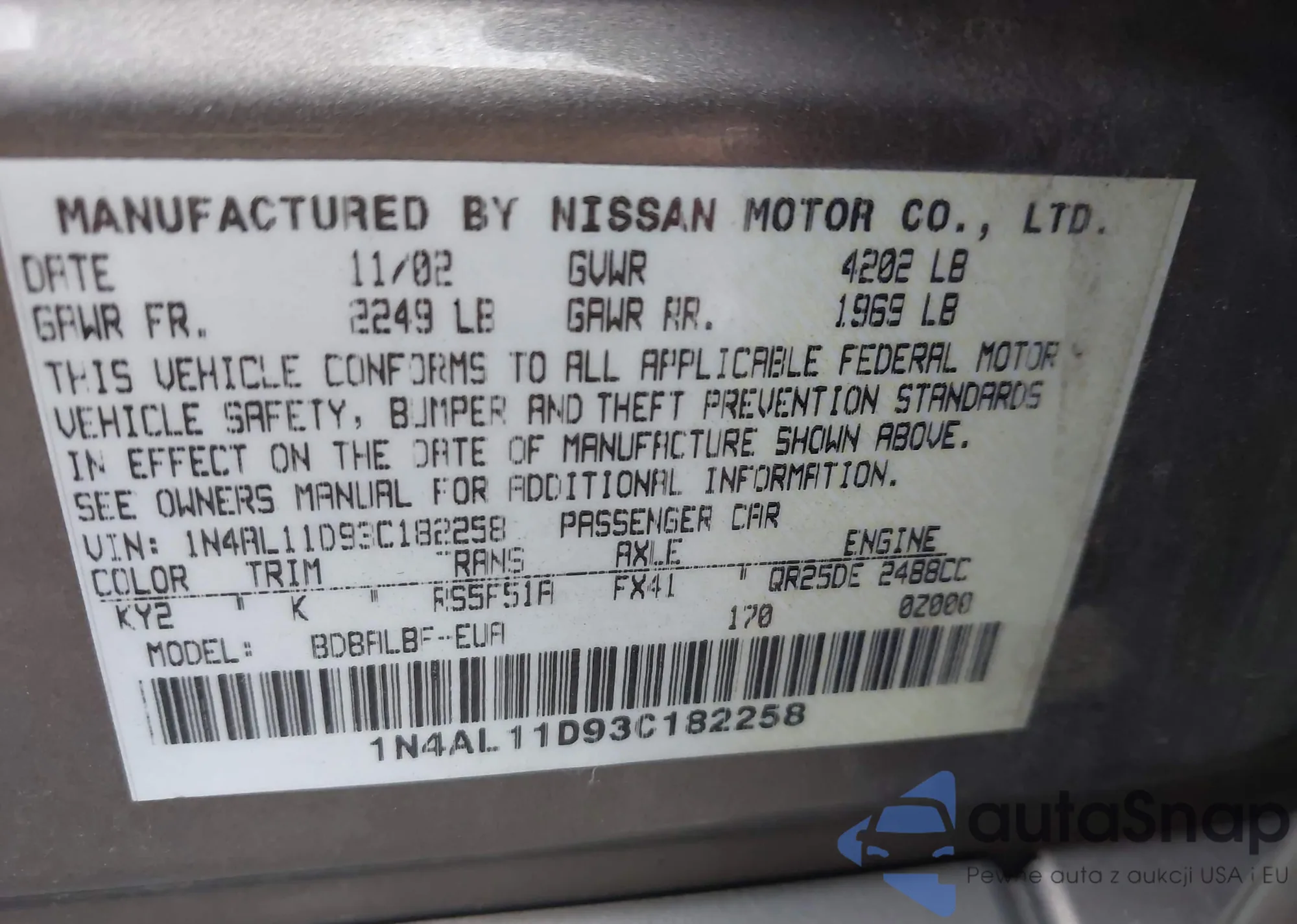 • VIN 1N4AL11D93C182258