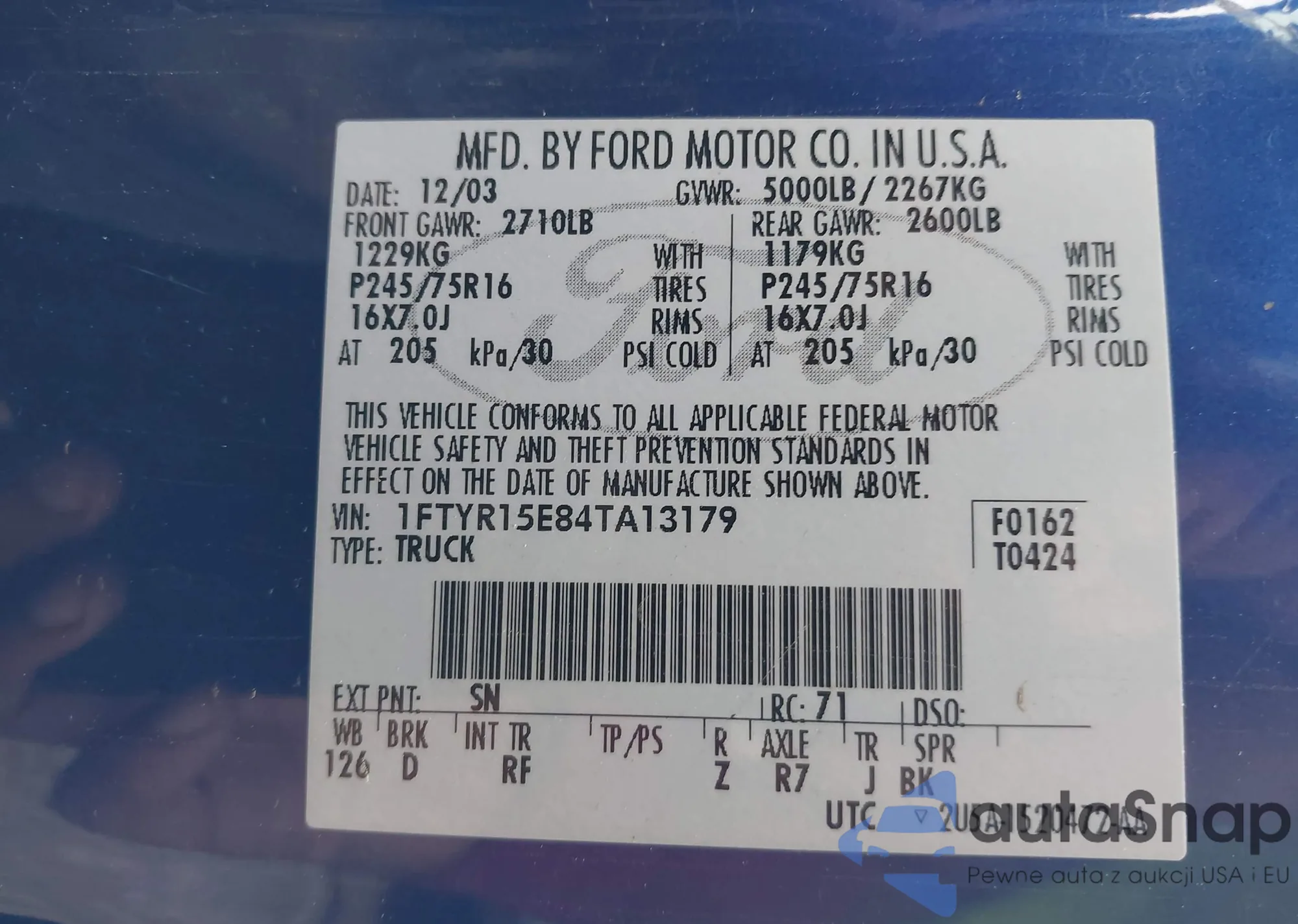 LOT: 43331264 VIN: 1FTYR15E84TA13179