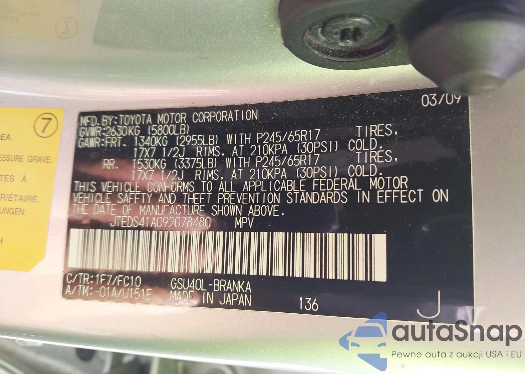 LOT: 43414943 VIN: JTEDS41A092078480