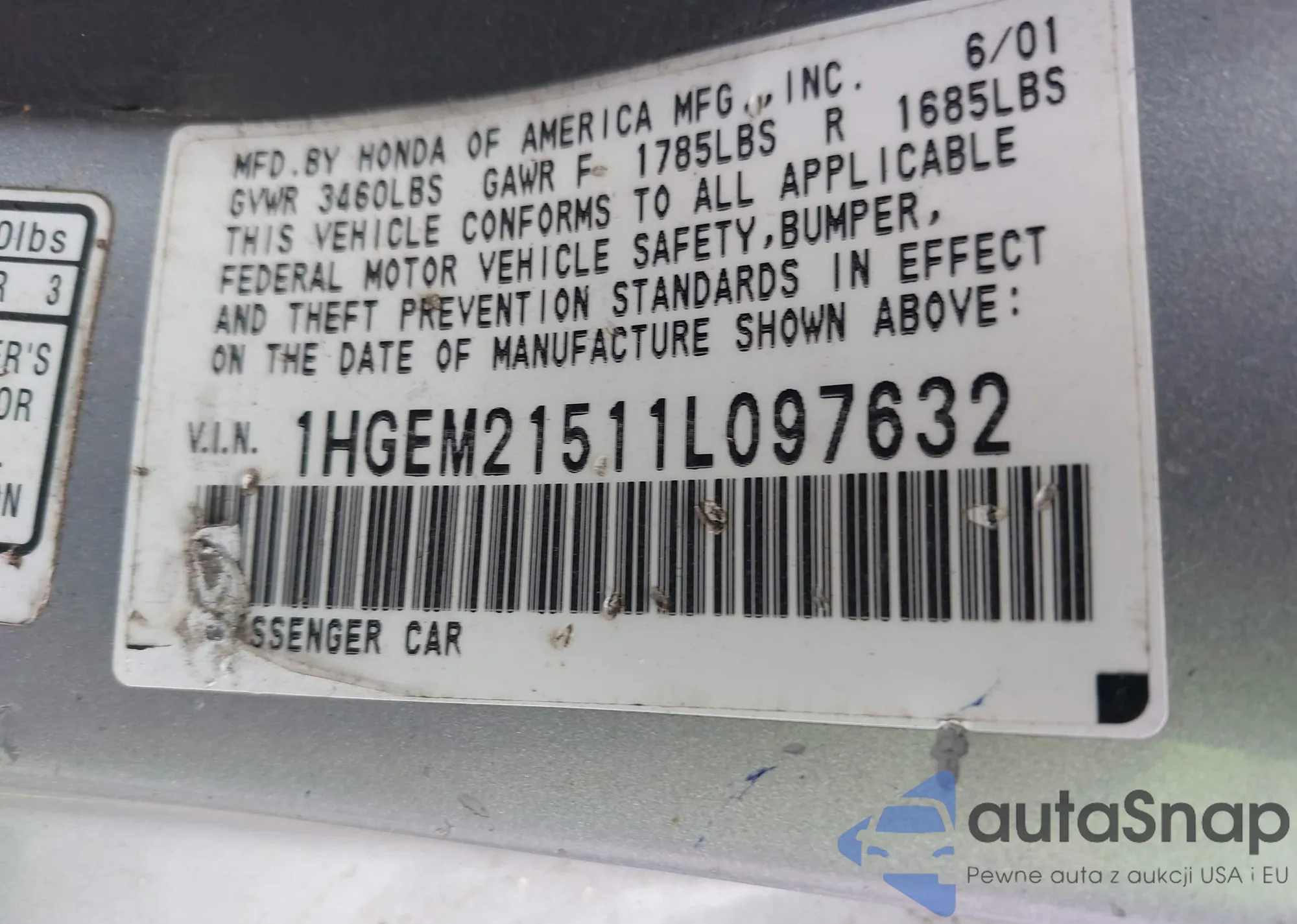 LOT: 43390712 VIN: 1HGEM21511L097632