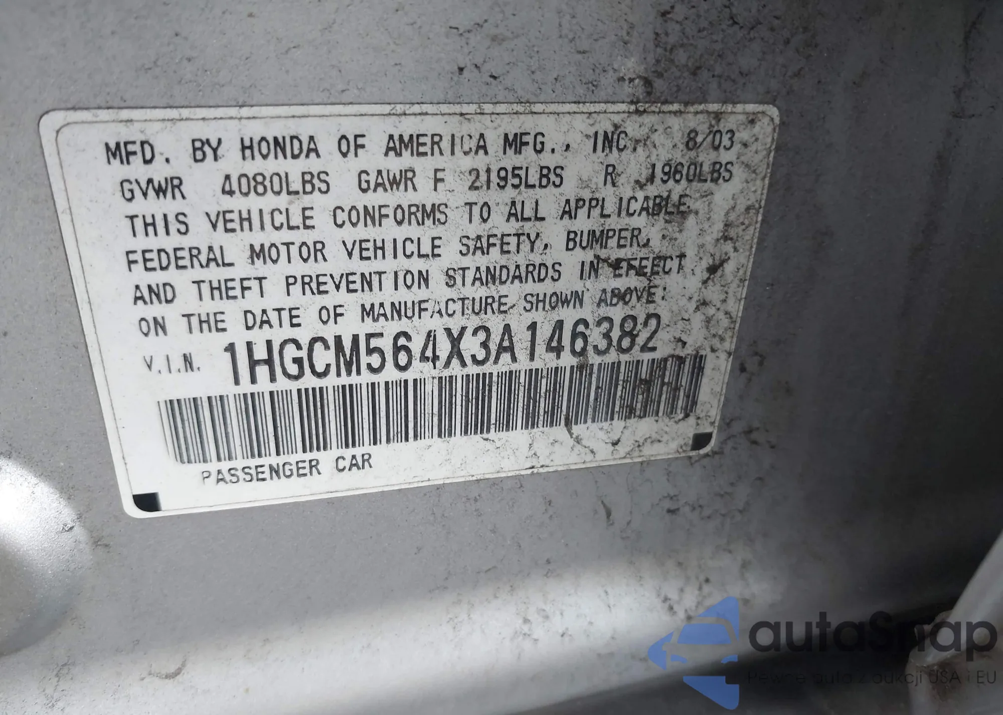 LOT: 43453099 VIN: 1HGCM564X3A146382