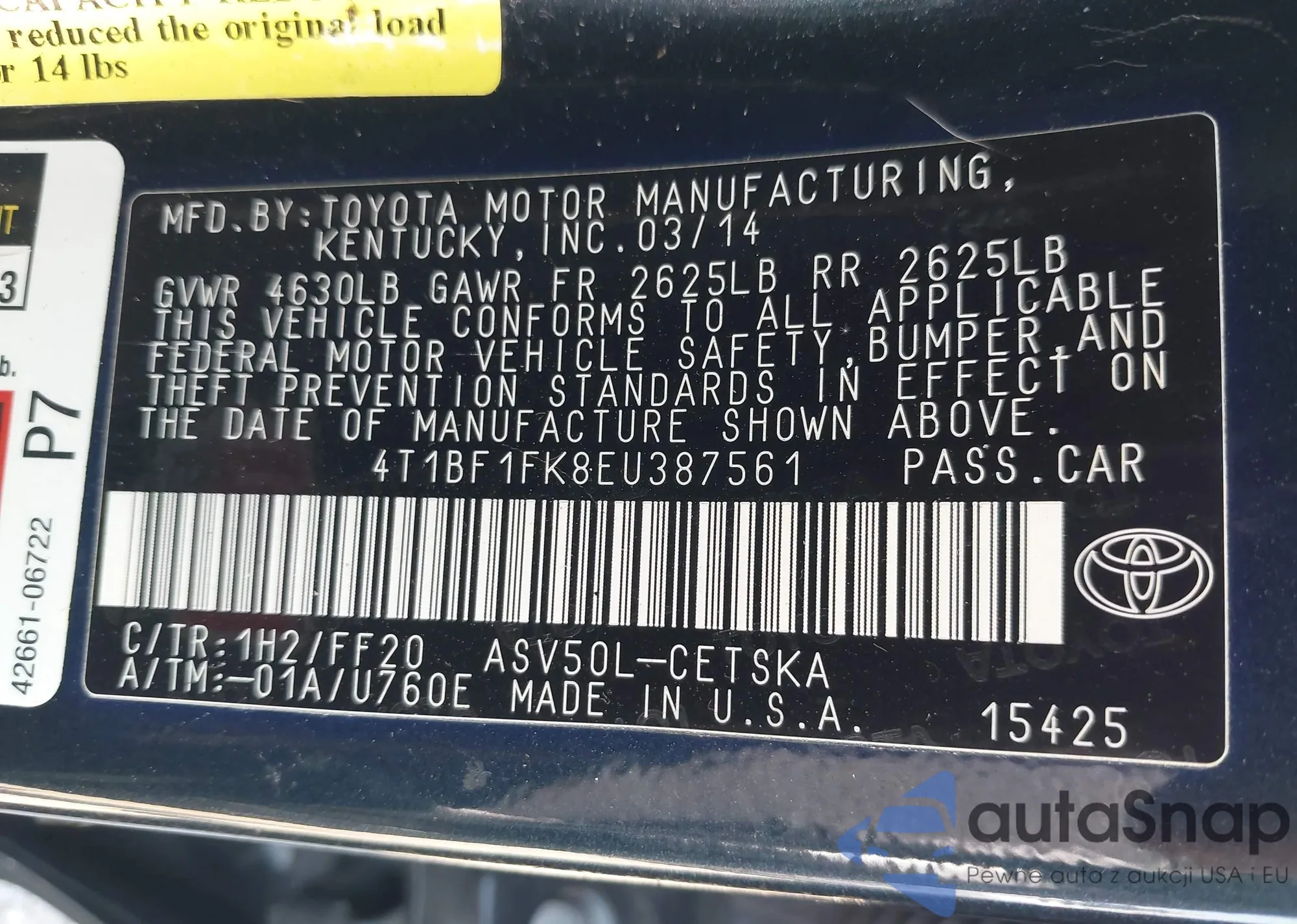 • VIN 4T1BF1FK8EU387561