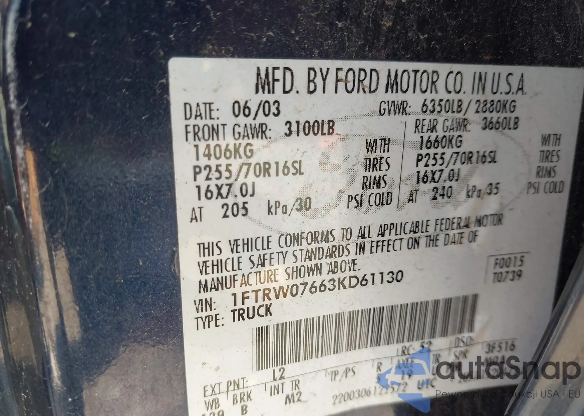 • VIN 1FTRW07663KD61130