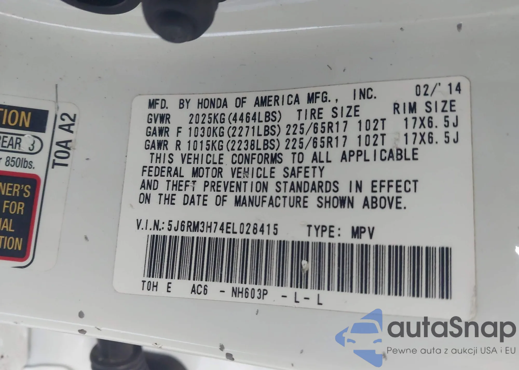 • VIN 5J6RM3H74EL028415
