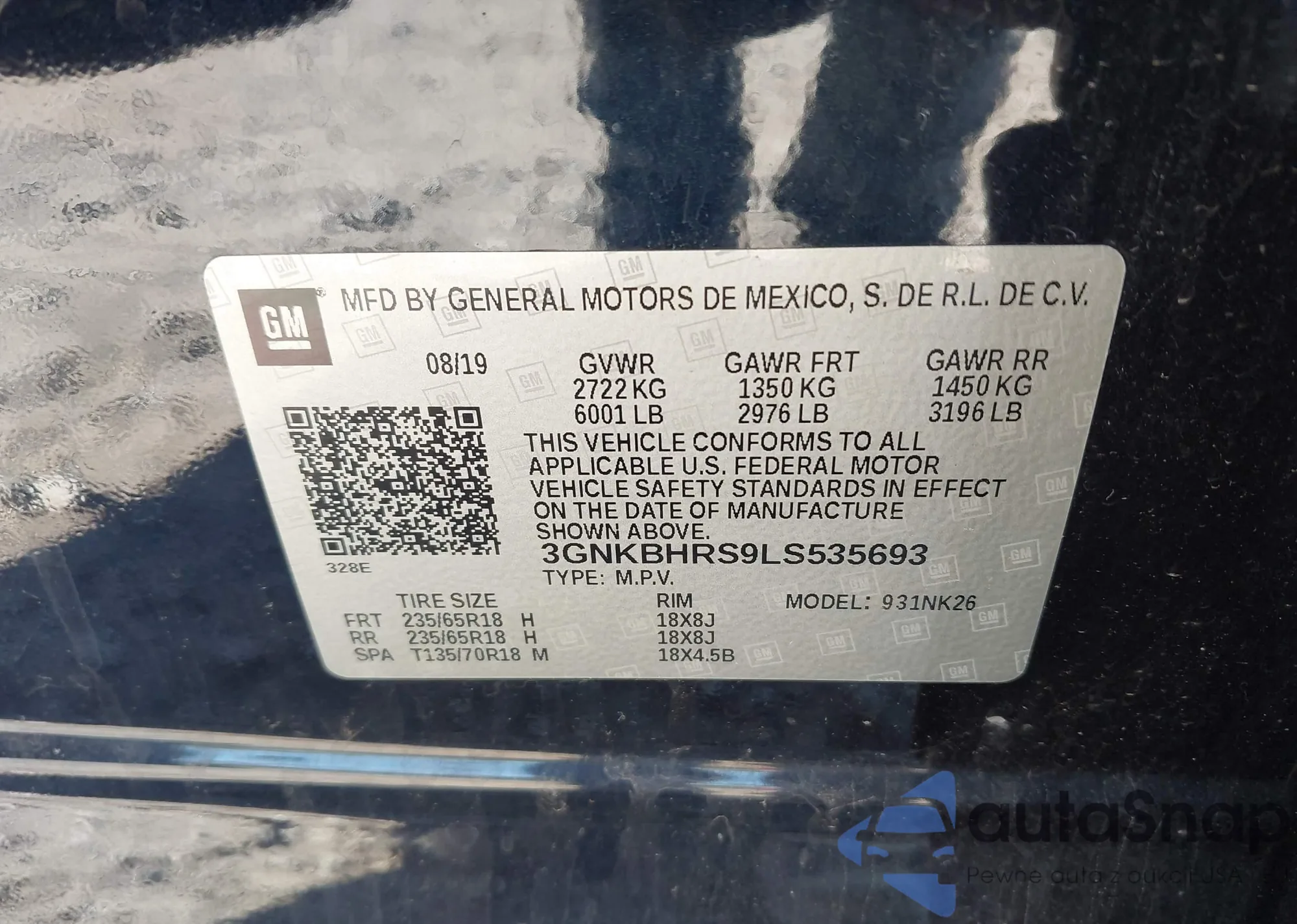 • VIN 3GNKBHRS9LS535693