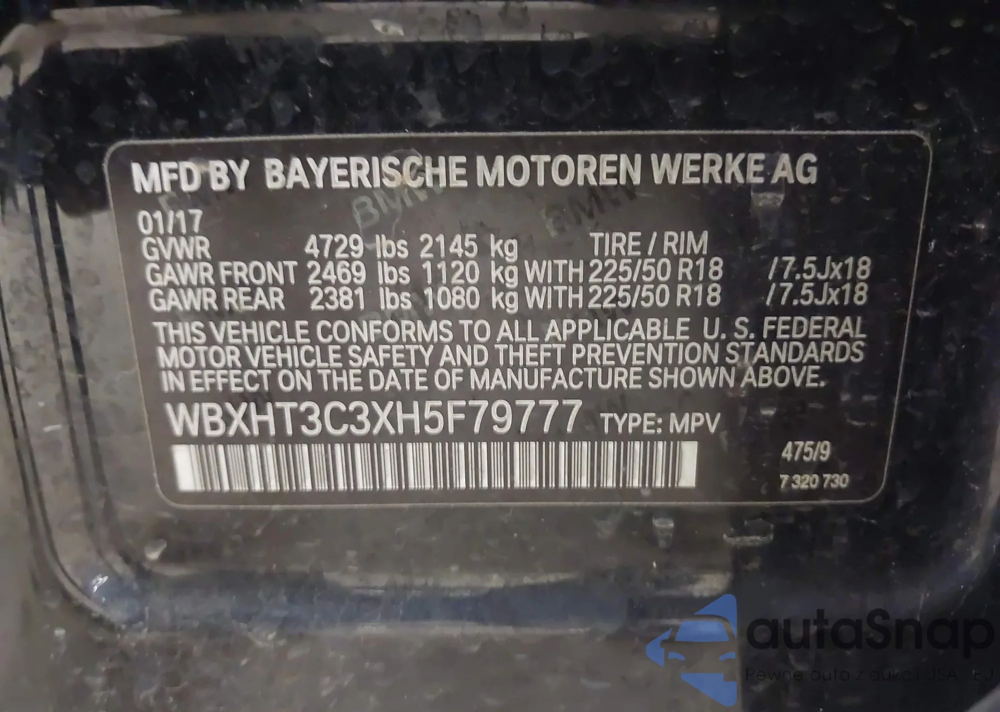 LOT: 43365571 VIN: WBXHT3C3XH5F79777