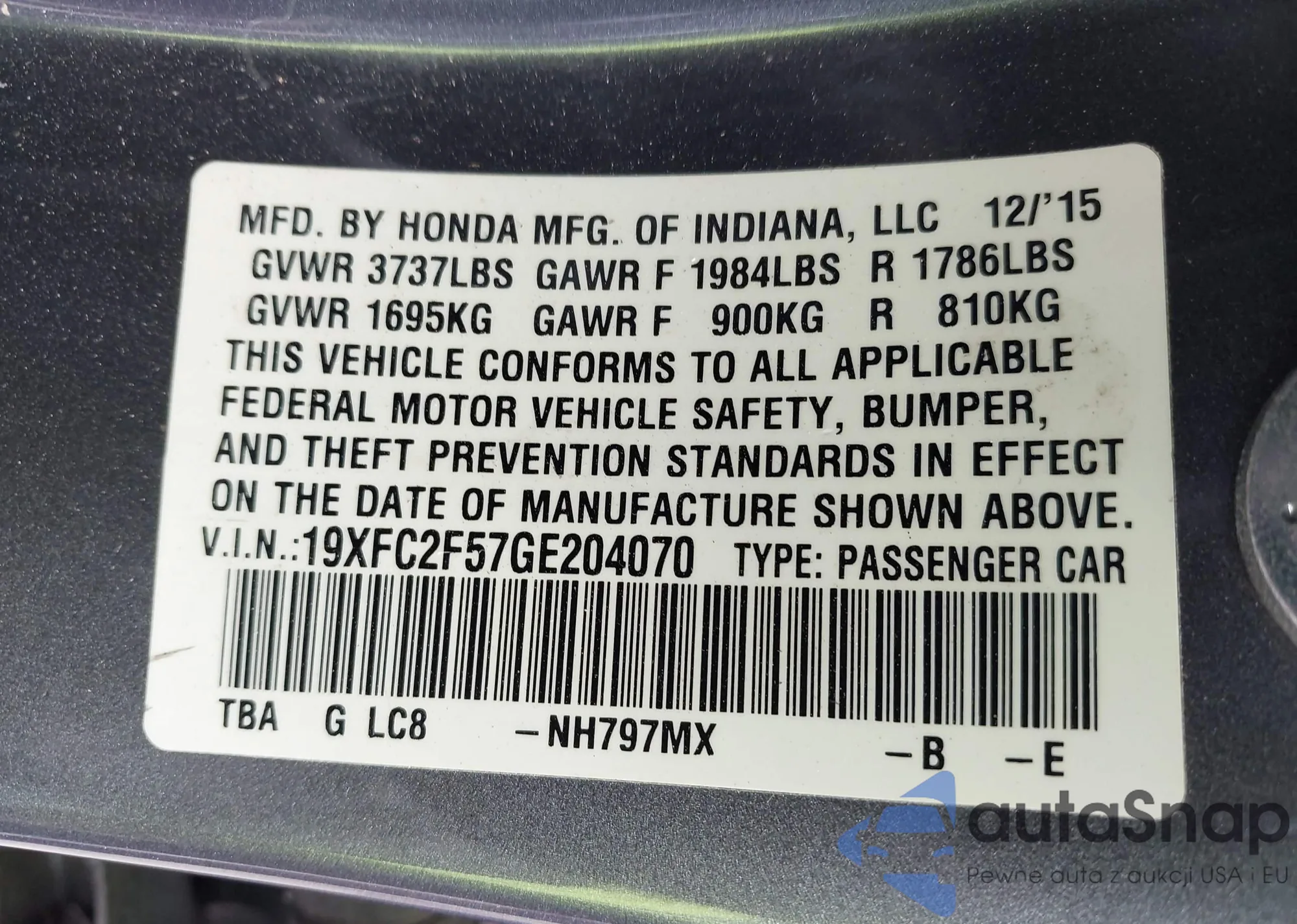 LOT: 43375917 VIN: 19XFC2F57GE204070